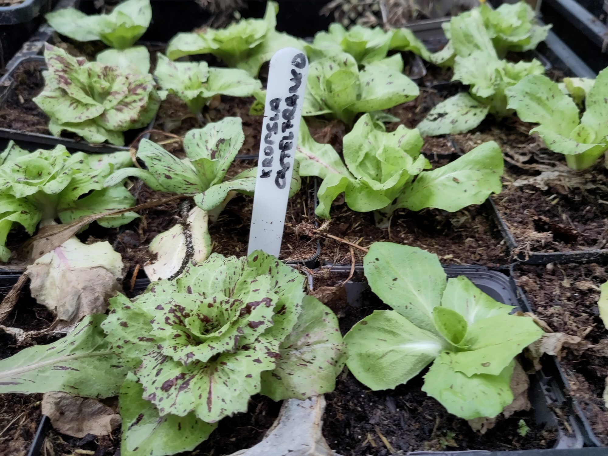 Sommige sla in de kas is verpietert maar de meeste planten beginnen op te leven zoals deze mooie castelfranco. Een bak met andere sla had trips maar dat is snel opgelost door een paar dagen buiten in kou en wind staan.
