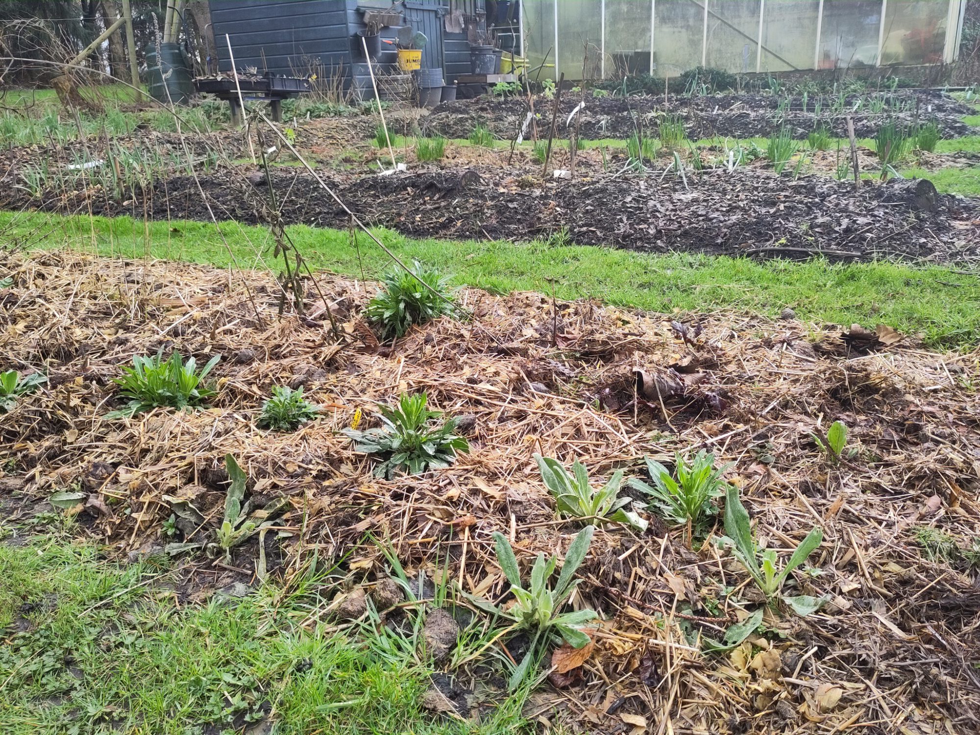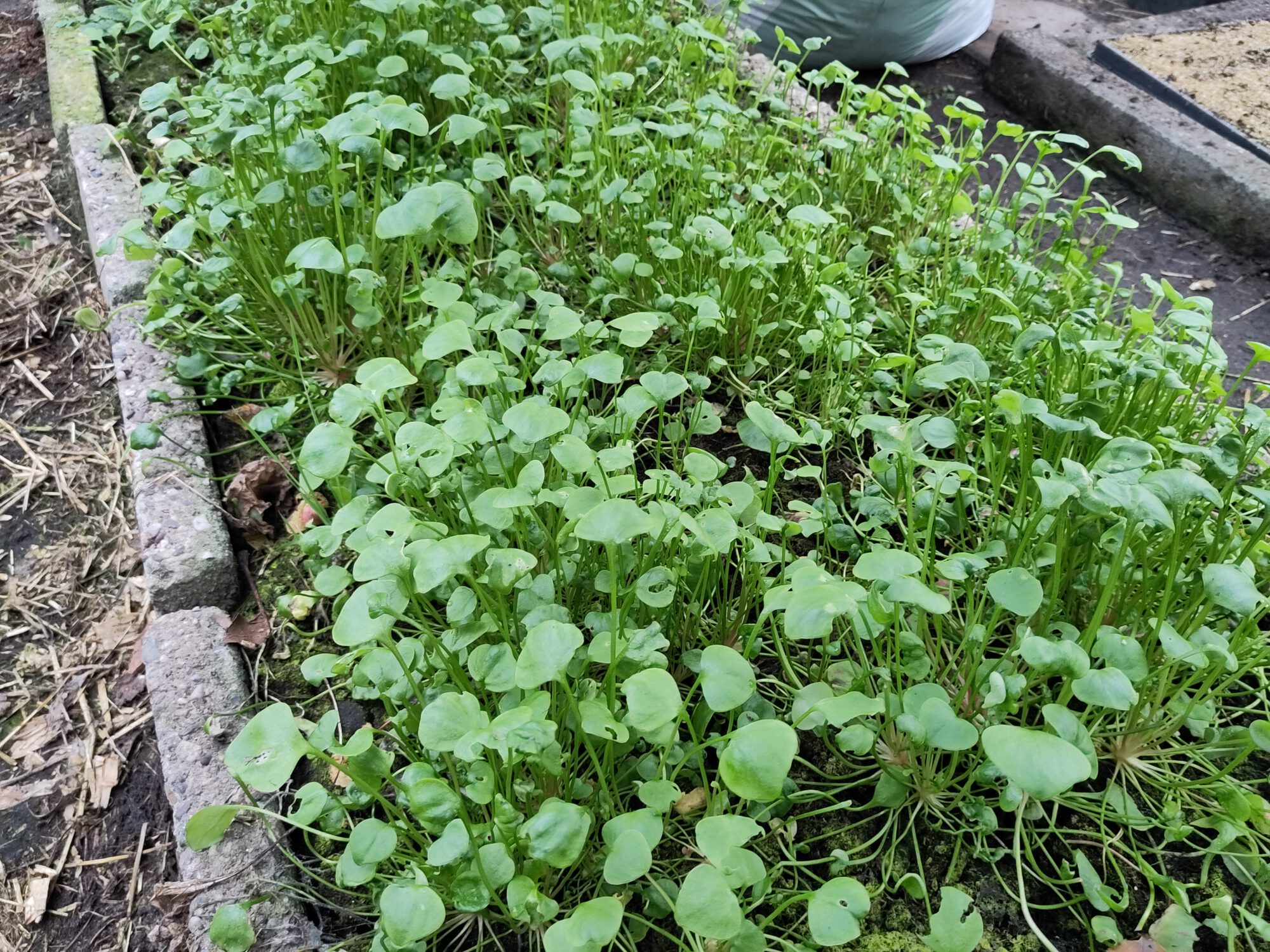 In de kas is de winterpostelein volop eetbaar nu, net als winterkervel. De misuna moet nog wat groeien.
