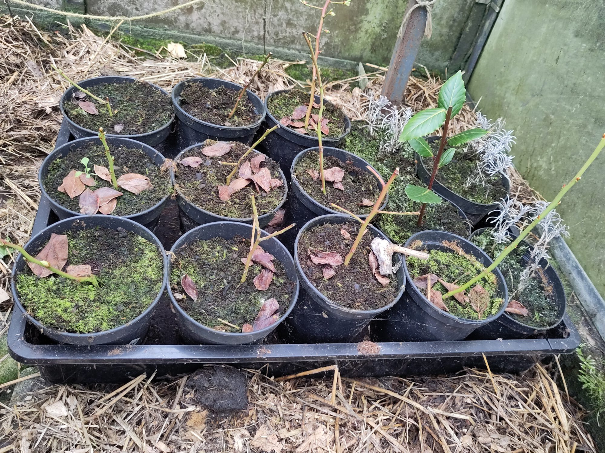 Ik had in de herfst winterstekken genomen van blauwe bes, kerriekruid en laurier. Op één na botten ze allemaal uit. Dat is een bovengemiddeld resultaat. Misschien omdat ze in de kas stonden? Of omdat ik nog groeikrachtiger scheuten heb gekozen?