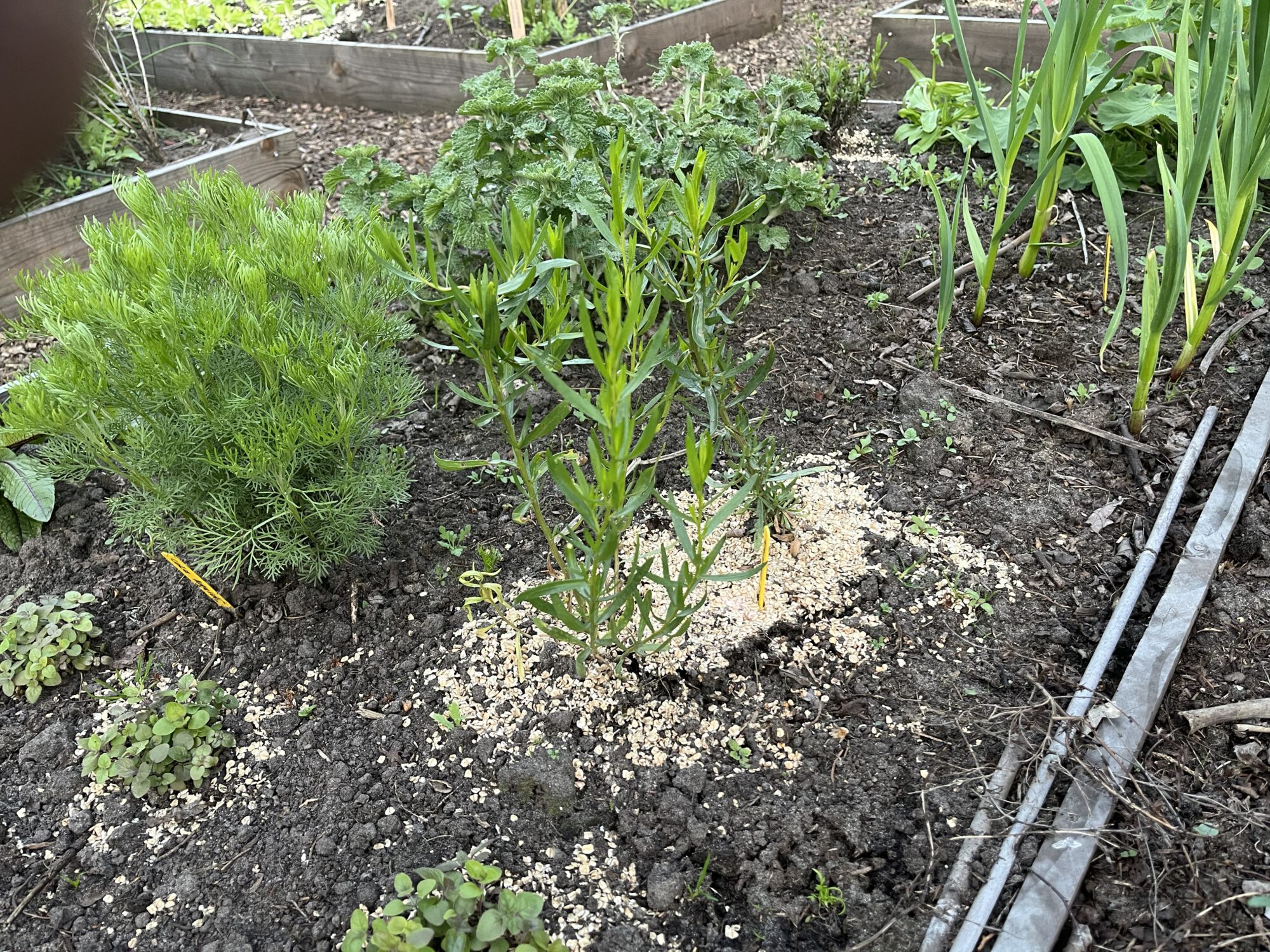 In Groei¶bloei stond havermout als remedie tegen slakken. We hebben inmiddels heel wat kilo’s biologische havermout in kleine cirkeltjes rond de meest kwetsbare en vaak jonge plantjes gestrooid. De slakken gaan zo te zien niet dood maar komen er op af en blijven in de havermout steken, dus ’s morgens gemakkelijk rapen. Het is nu droog en warm, dus de slakkendruk is niet te vergelijken met vorig jaar. De test gaat nog wel even door. De havermout gaat op den duur schimmelen en verdwijnt. Hoe dan ook houden we het allemaal nu wel biologisch in de hand.
