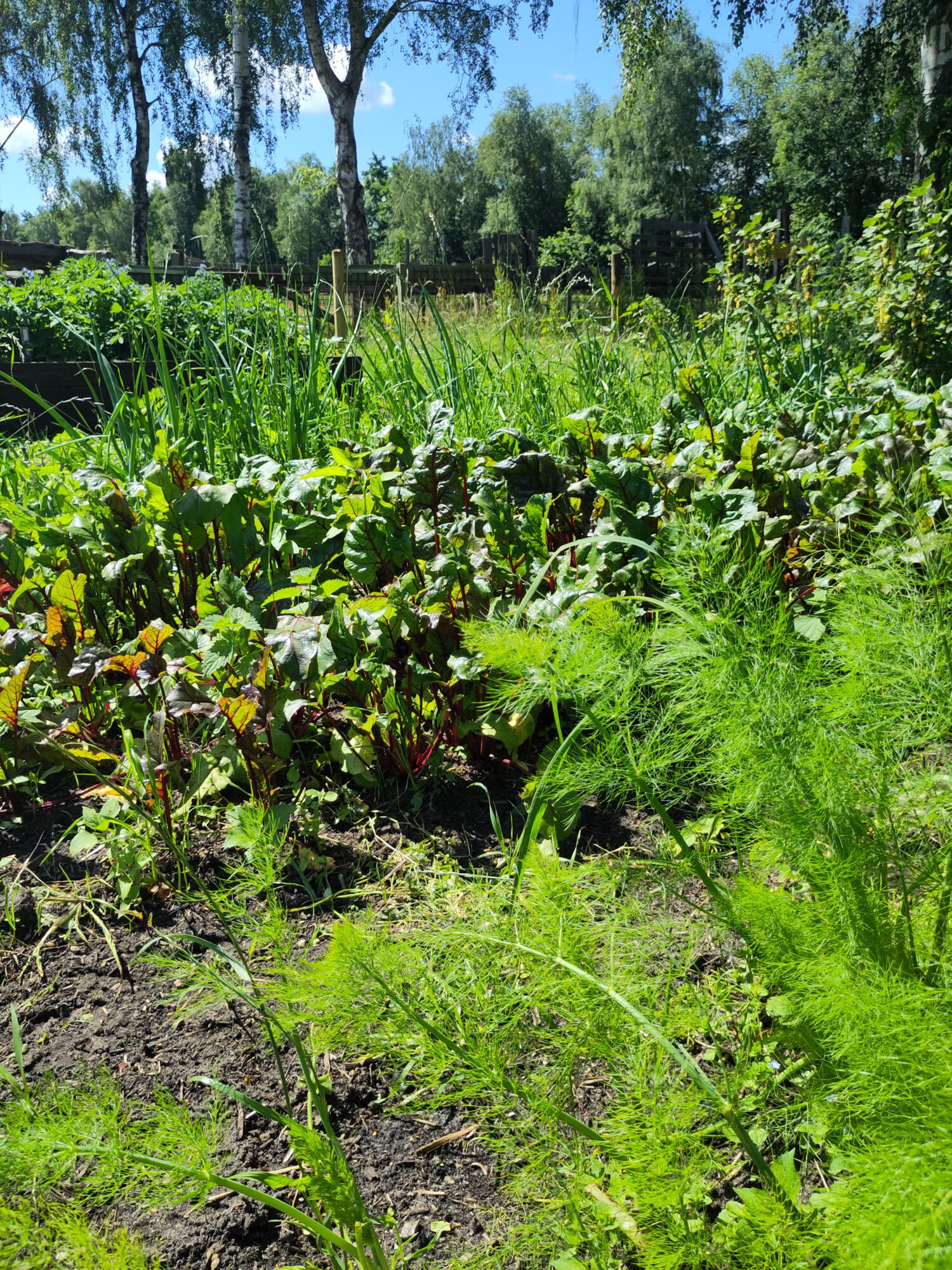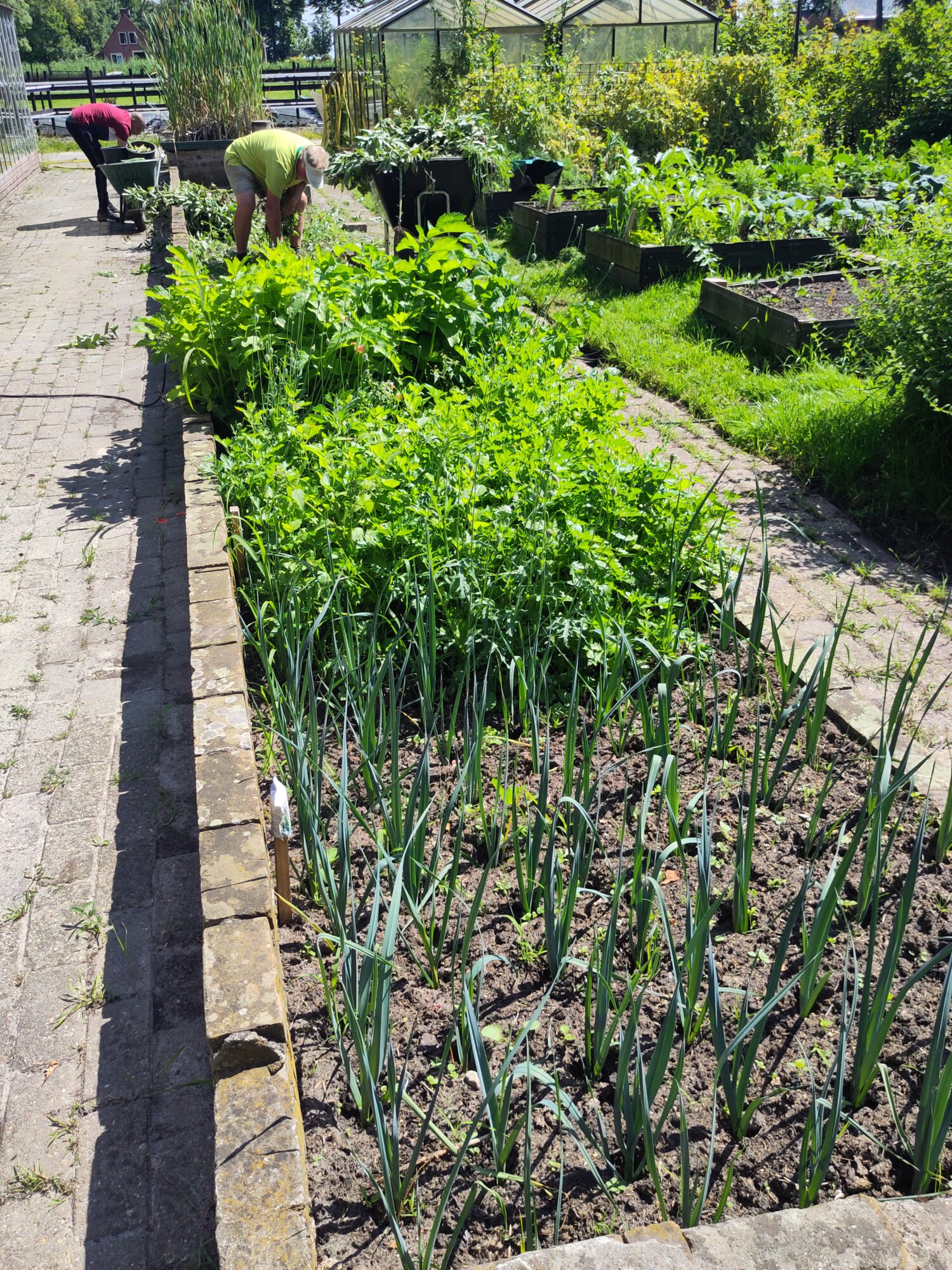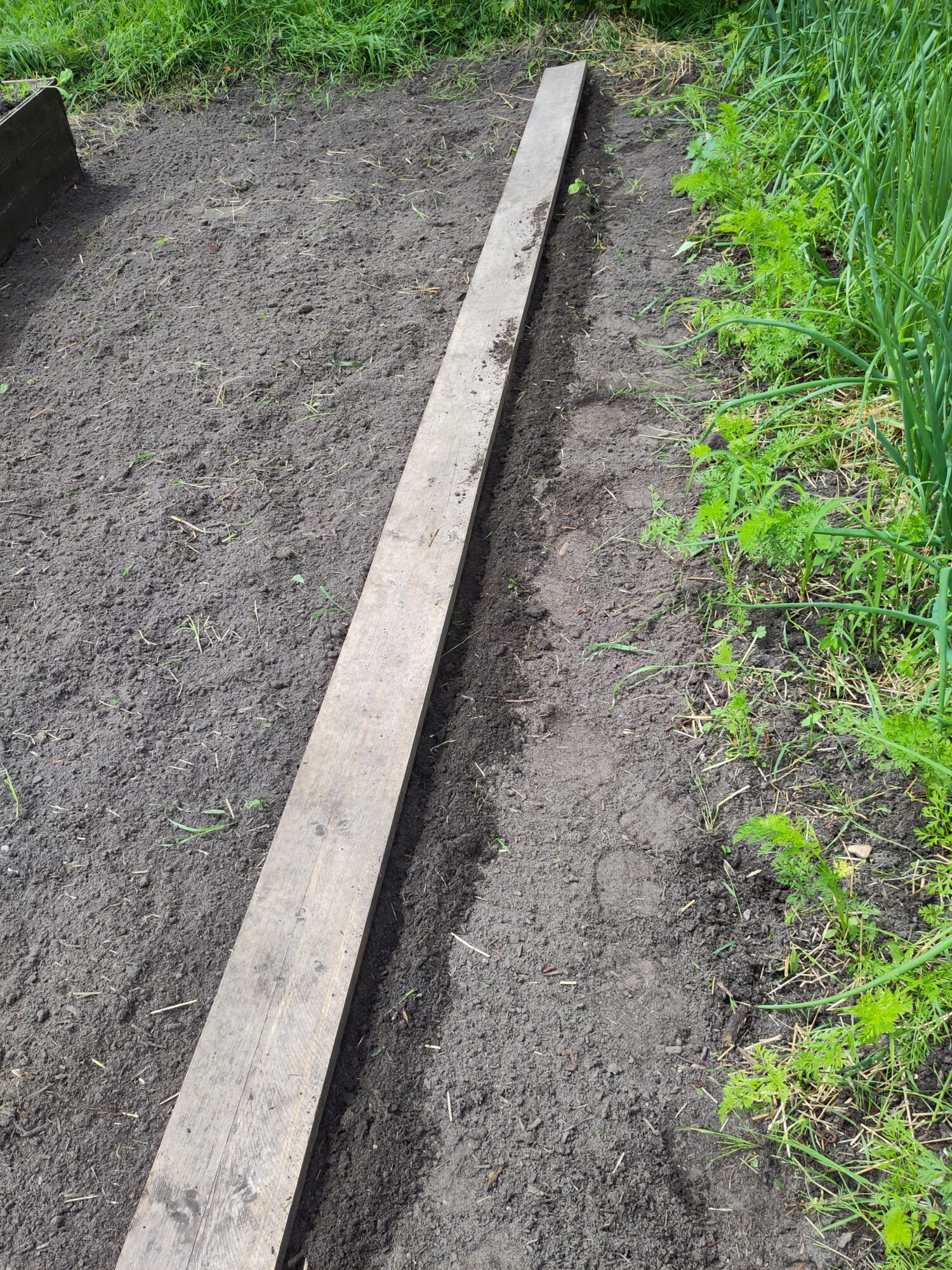 Begin juni komt de oogst op gang van doperwten, bladvenkel, bladselderij, peterselie, tuinbonen, en heel veel kruiden. Andere planten dijen uit, maar er moet ook weer gezaaid worden in vrijgevallen vakken. Dat kan nu lekker in de volle grond. Spinazie bijvoorbeeld. Een trucje is om voren te trekken met de zijkant van een schoffel die meteen de vorige rij dichtzet. Ik gebruik een steigerplank van 4 meter waarop ik loop. Door mijn gewicht kan ie ook niet verschuiven. Dat het bed daarvoor natuurlijk helemaal onkruidvrij en glad geharkt moet zijn is noodzakelijk.