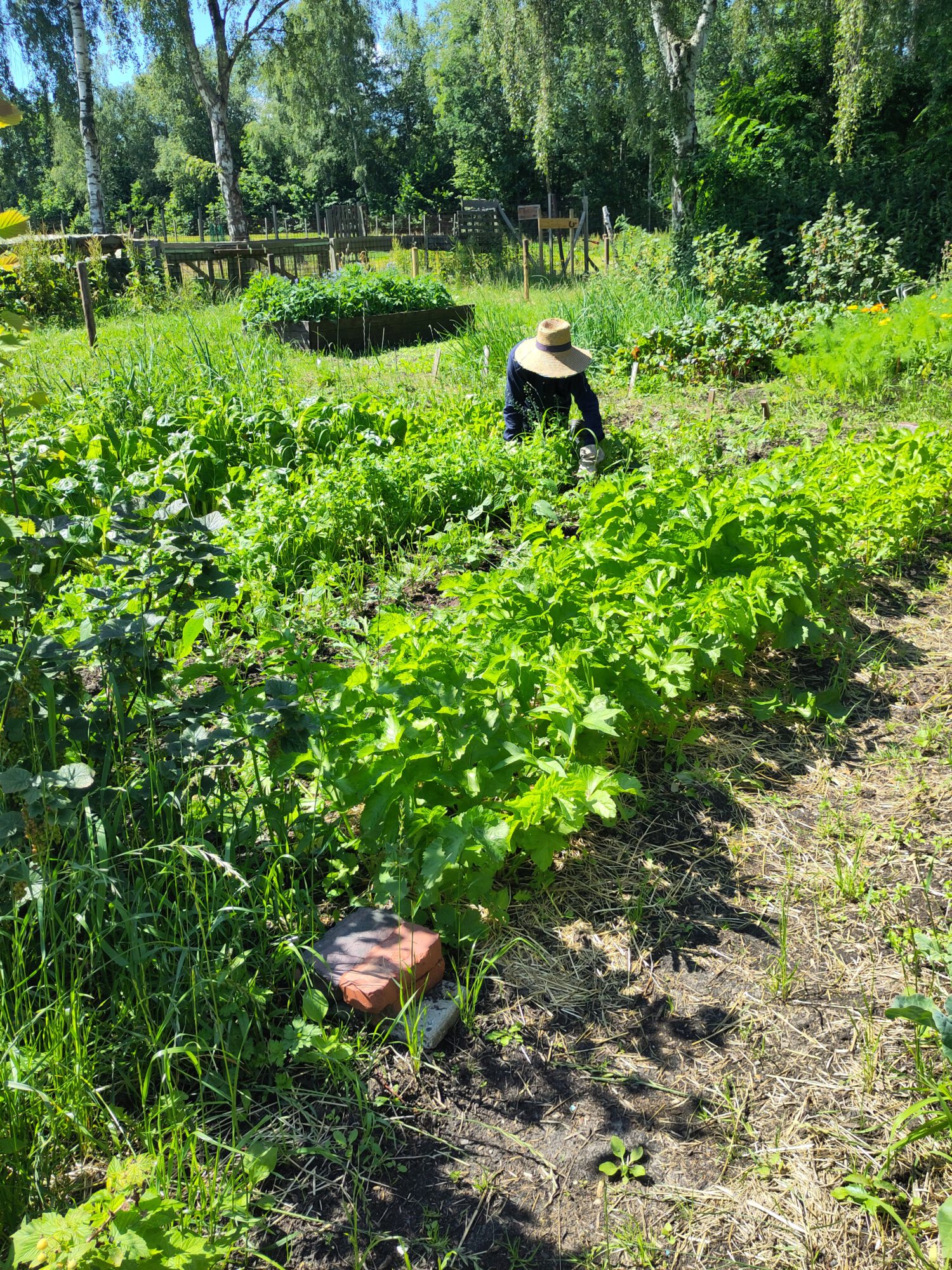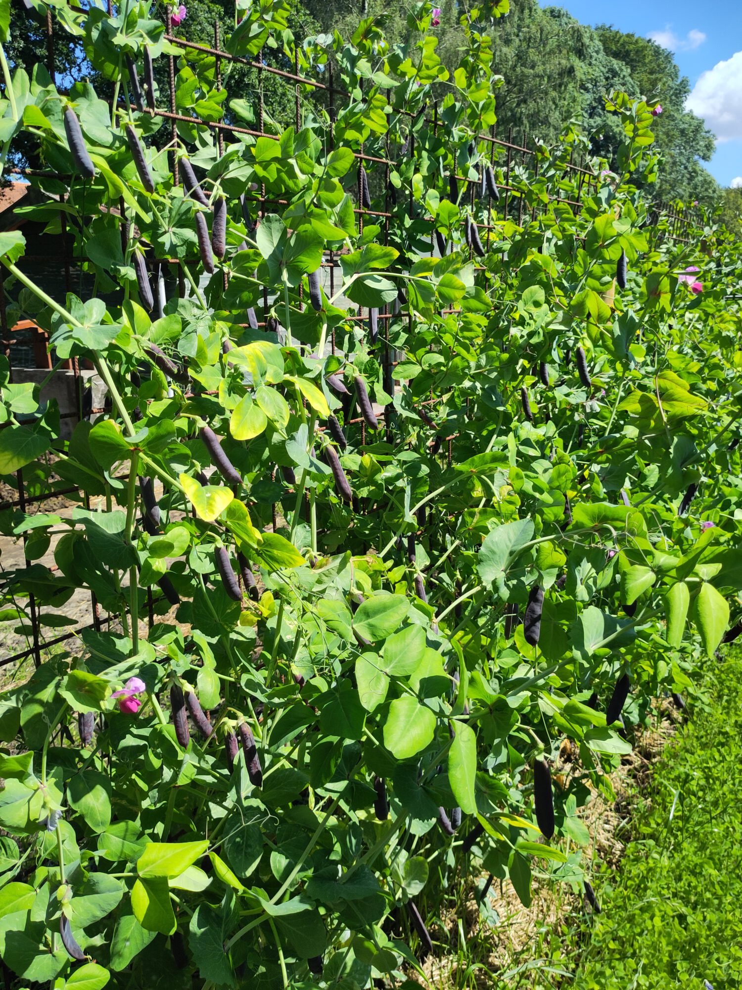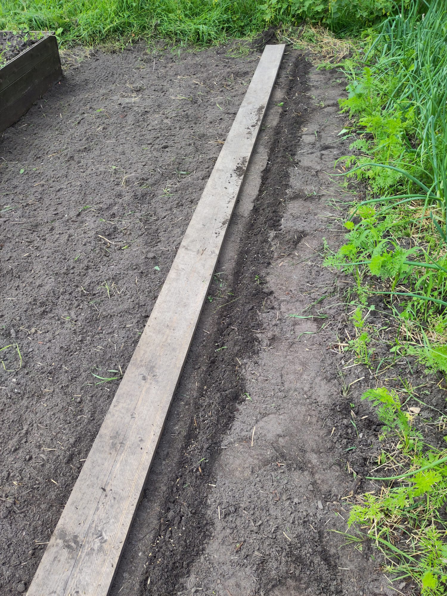 Begin juni komt de oogst op gang van doperwten, bladvenkel, bladselderij, peterselie, tuinbonen, en heel veel kruiden. Andere planten dijen uit, maar er moet ook weer gezaaid worden in vrijgevallen vakken. Dat kan nu lekker in de volle grond. Spinazie bijvoorbeeld. Een trucje is om voren te trekken met de zijkant van een schoffel die meteen de vorige rij dichtzet. Ik gebruik een steigerplank van 4 meter waarop ik loop. Door mijn gewicht kan ie ook niet verschuiven. Dat het bed daarvoor natuurlijk helemaal onkruidvrij en glad geharkt moet zijn is noodzakelijk.