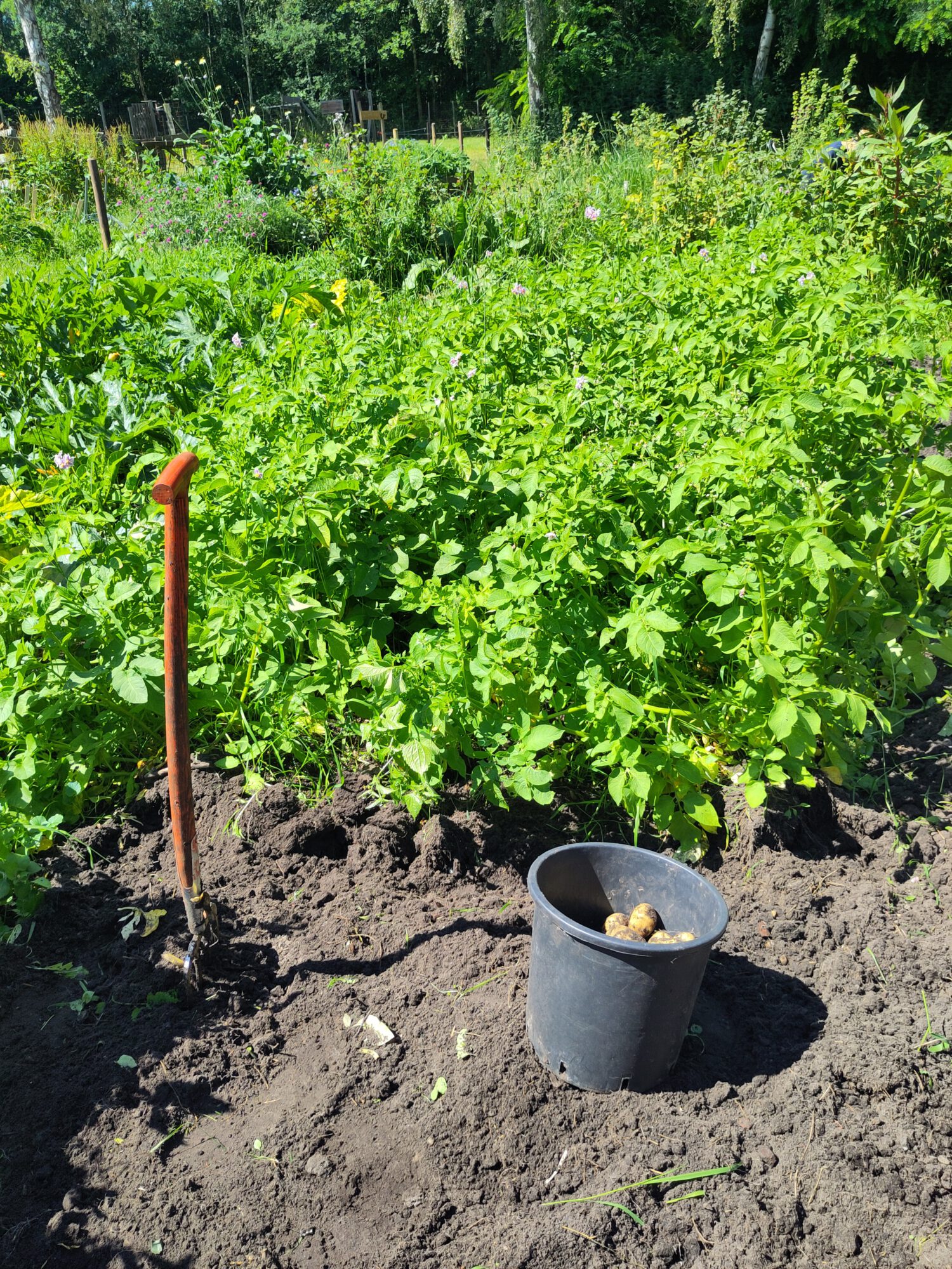 Juni is de eerste maand met veel oogst, misschien meer dan je op kan. Prijs je gelukkig als je weinig slakkendruk hebt. Op goed bemeste grond zijn de pompoenen nu al voetbalgroot. Op de spetsehoeve wordt nu elke week het winkeltje aan de weg bijgevuld: o.a. courgettes, aardappelen, koolrabi, knoflook, sla, tuinbonen, doperwten, kapucijners.