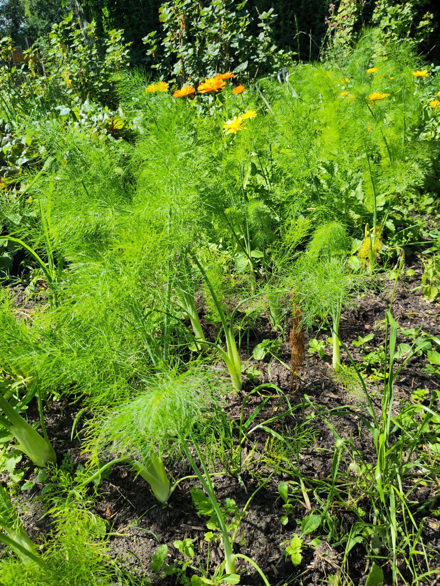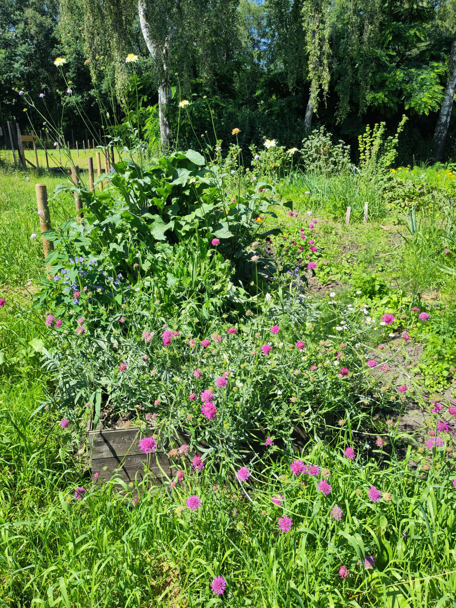 Half mei nu en warm weer. De bieslook gaat massaal bloeien. De pastinaak doet het geweldig dankzij de paardenmest van afgelopen herfst. Dit zijn tweedejaarsplanten die ik in bloei laat komen voor het zaad en voor het mooi. Anders had ik ze vorig jaar al moeten oogsten.Als je veel blad wil plukken moet je de bloemen wegknippen, maar er komen hoe dan ook ook weer jonge stengeltjes op.
