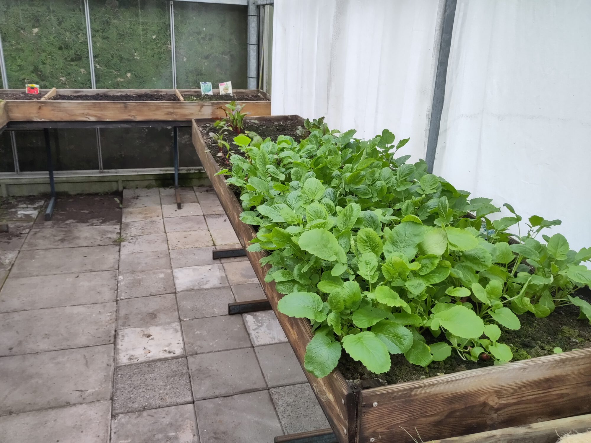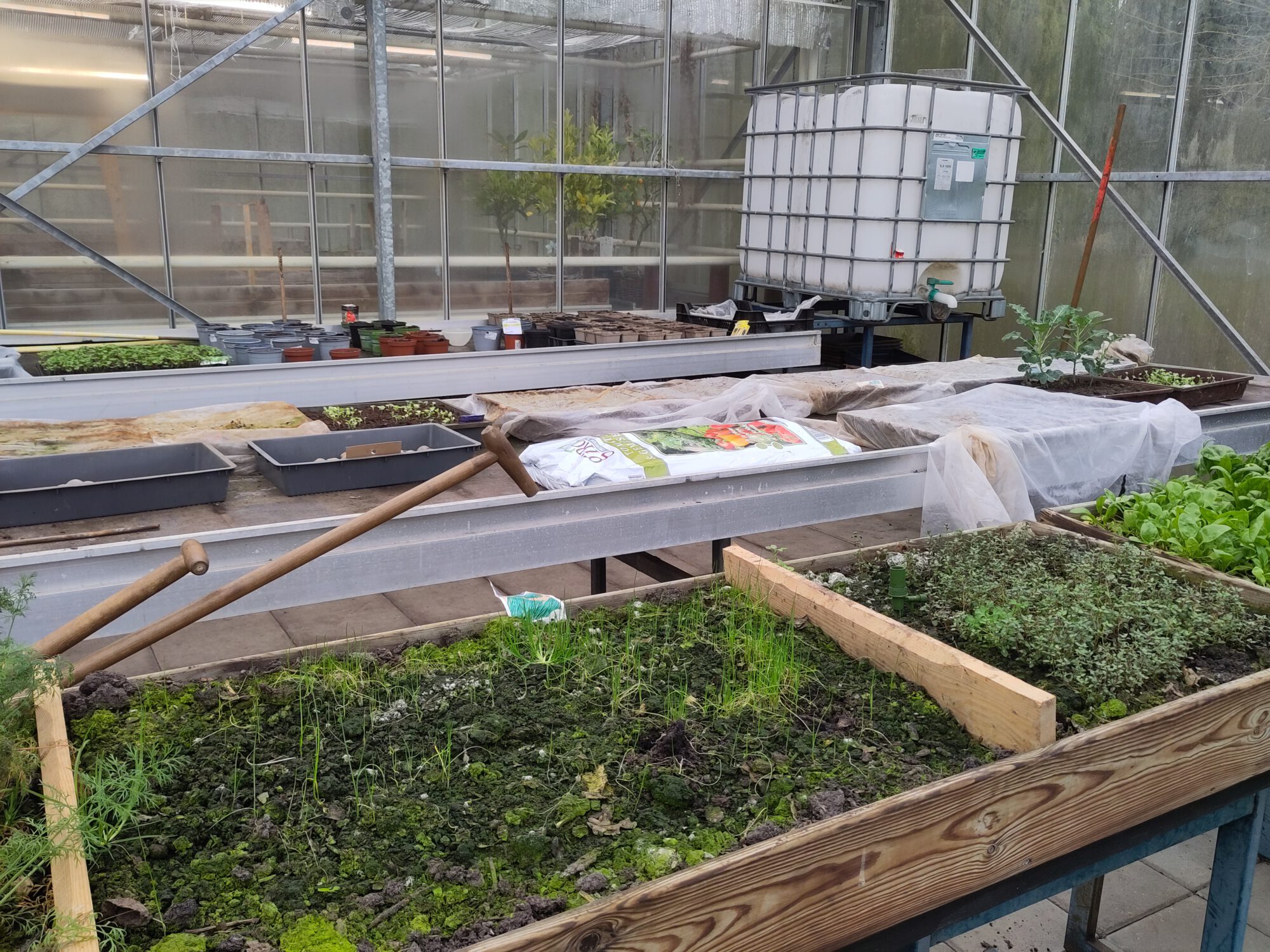Kleinere kas met werktafels in het midden. Het valt op hoe geordend en netjes zij werken.