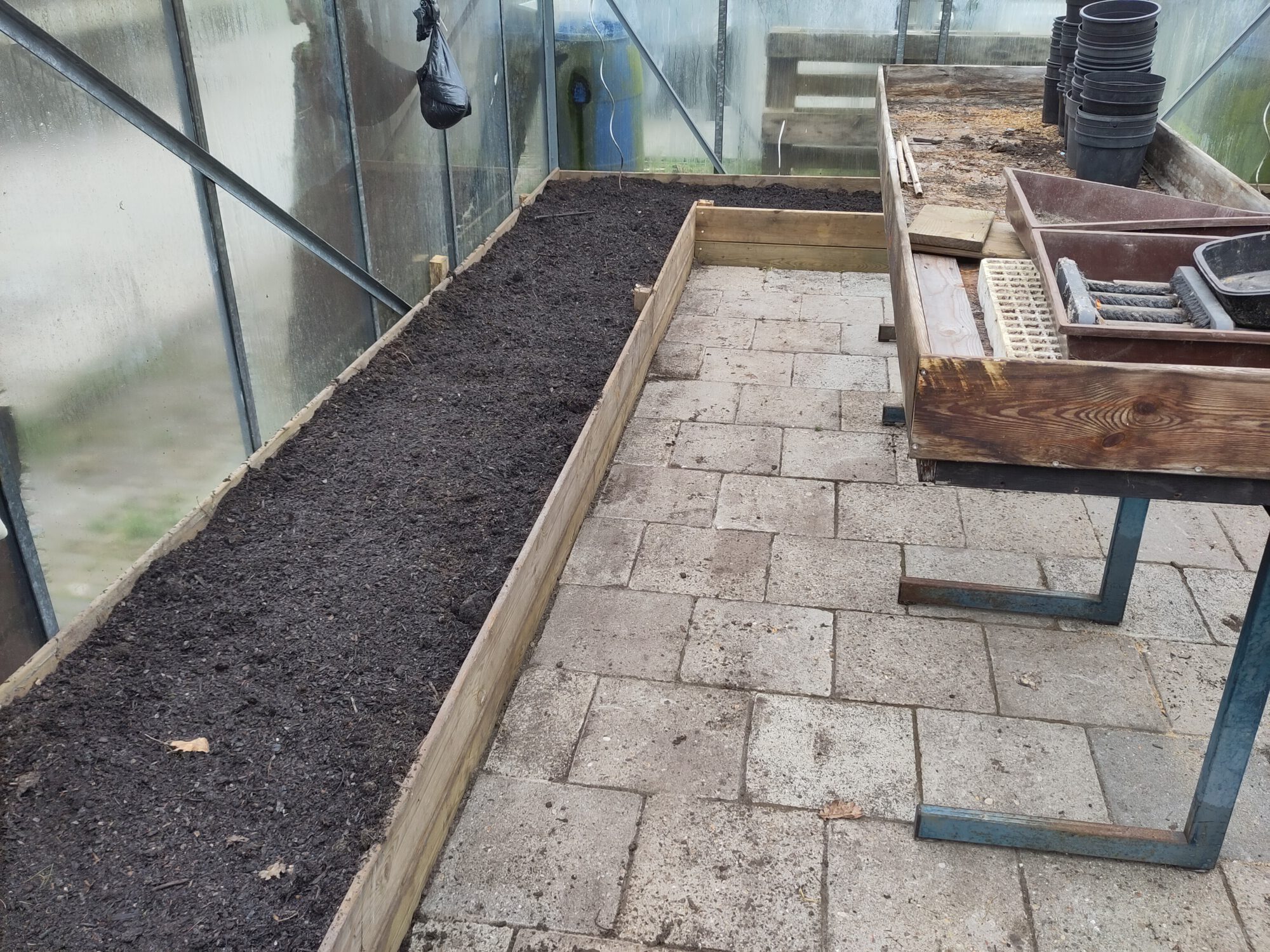 Kweek en oppot tafels in de koude kas met beetje hulpverwarming voor +12 graden. Erachter is een verwarmde kas waar de anjers al in februari een cm of 20 zijn.