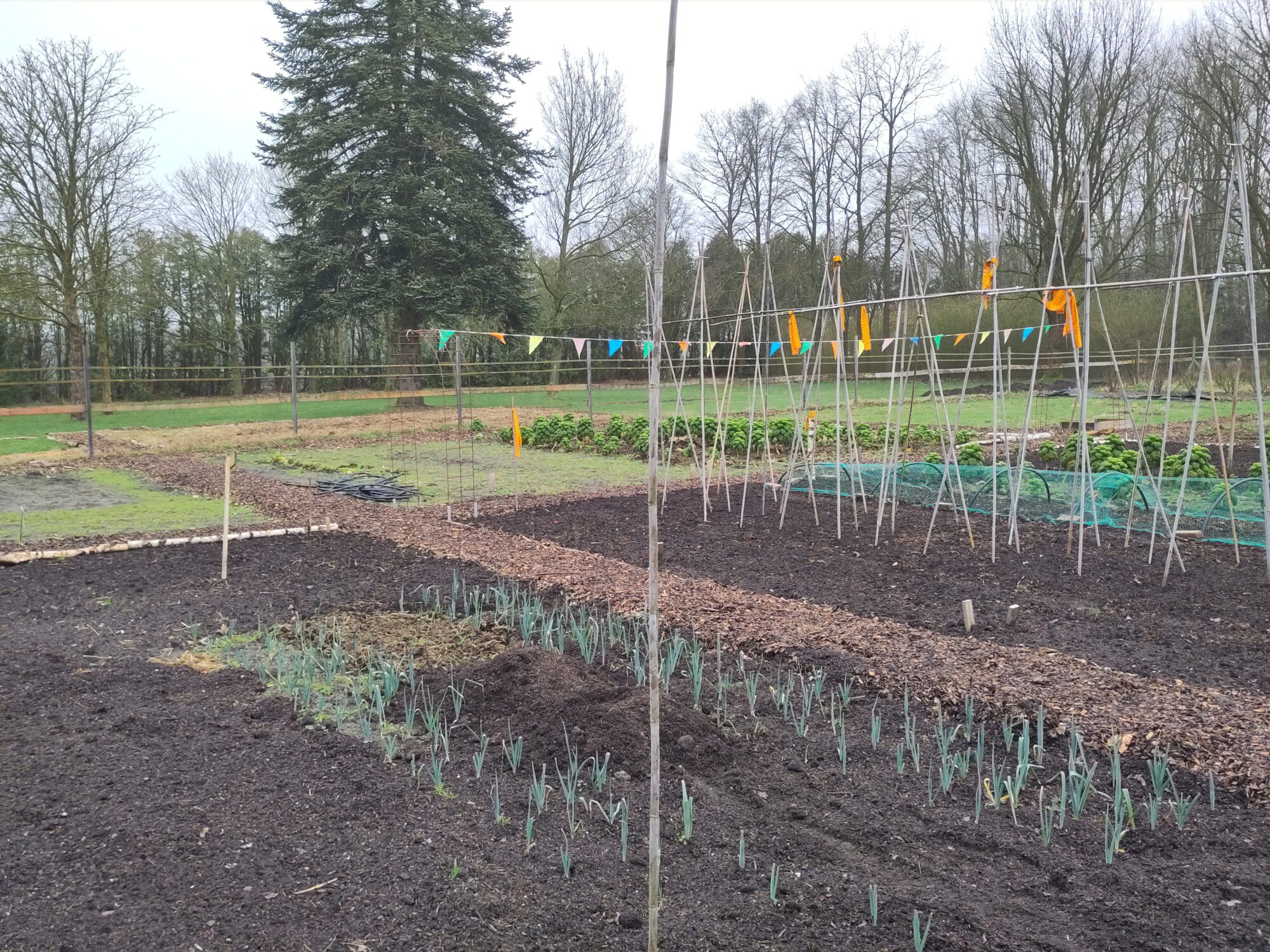 Een stukje van de moestuin die in gedeeld is in 6 grote vierkanten voor wisselteelt waarbinnen de bedden zijn. Snopperpaden eromheen en het geheel binnen een 2 meter hoog hek tegen de reeën.