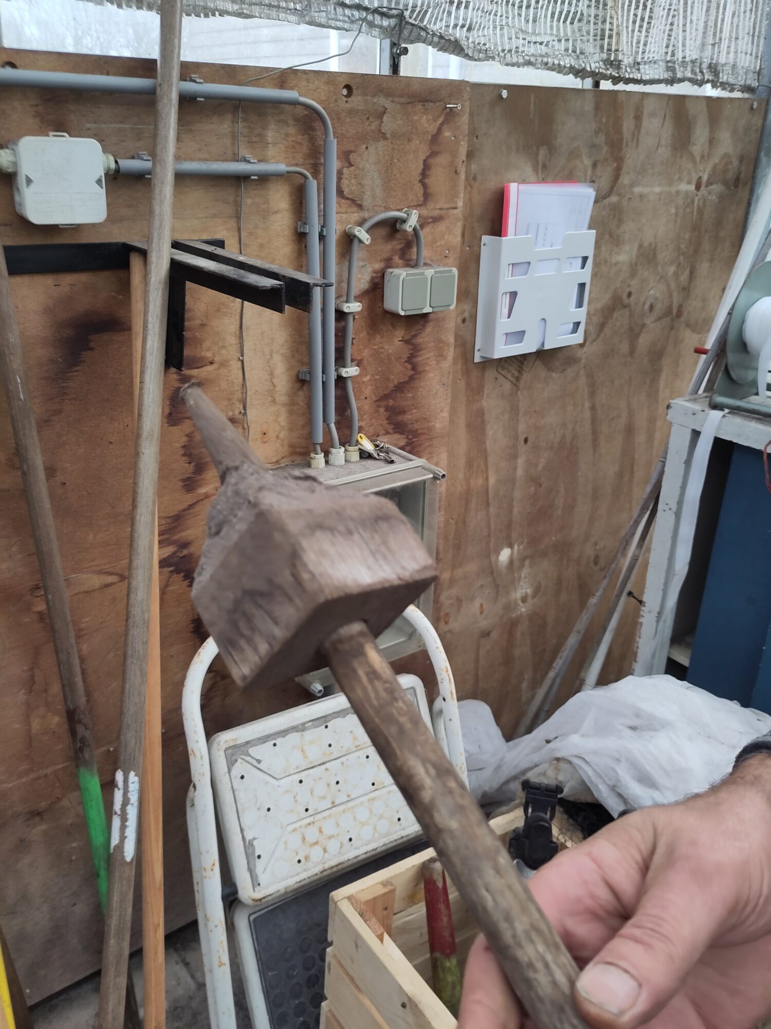 Sjon laat graag zijn gereedschap zien, hier bij een zelfgemaakte wrikstok met punten van oude hooivorken.