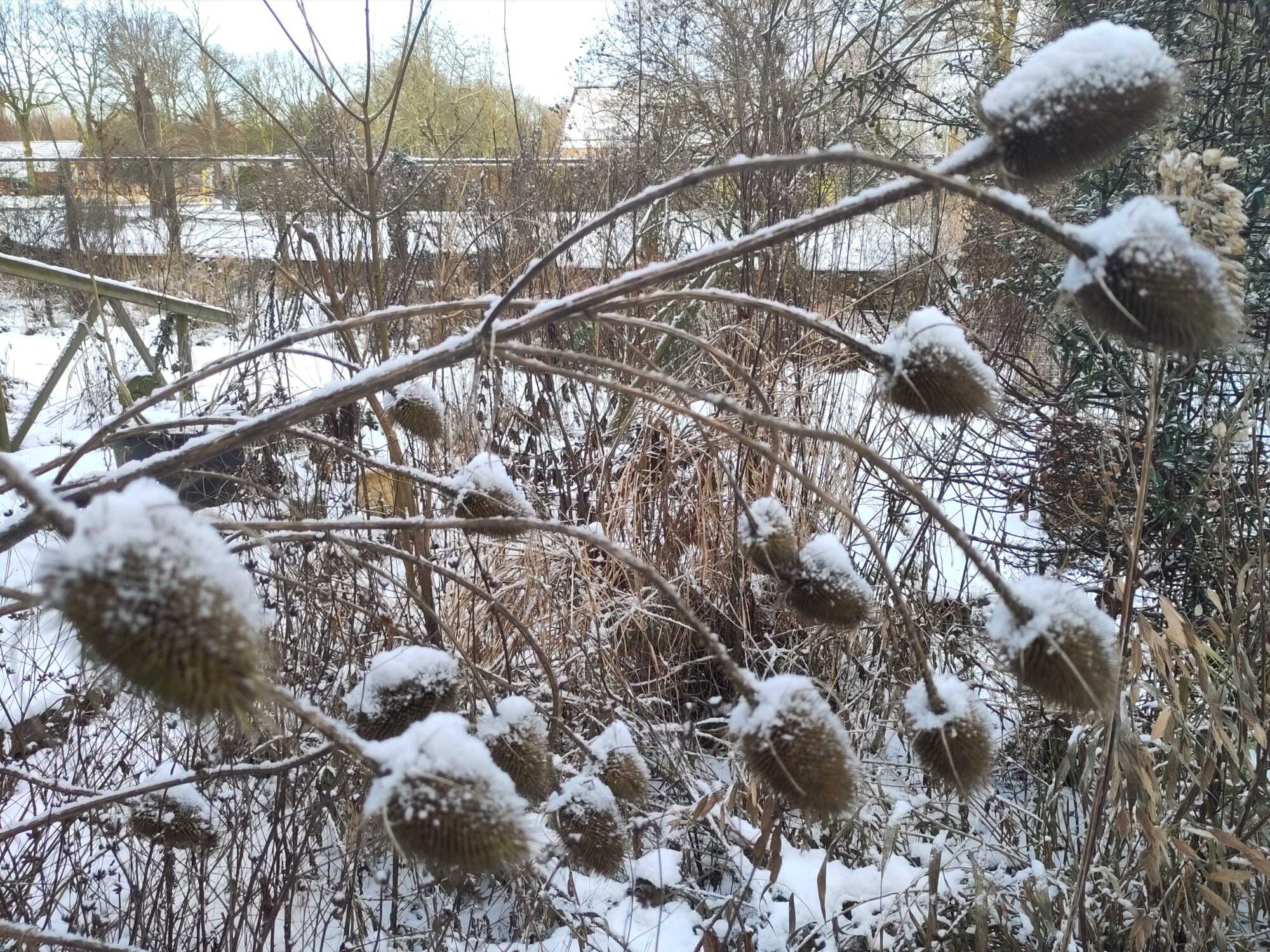 Verder is het in de siertuin of als je bloemen tussen de groentes hebt staan genieten van de uitgebloeide staken. Vooral als er sneeuw op ligt. In maart is pas de grote opruiming.
