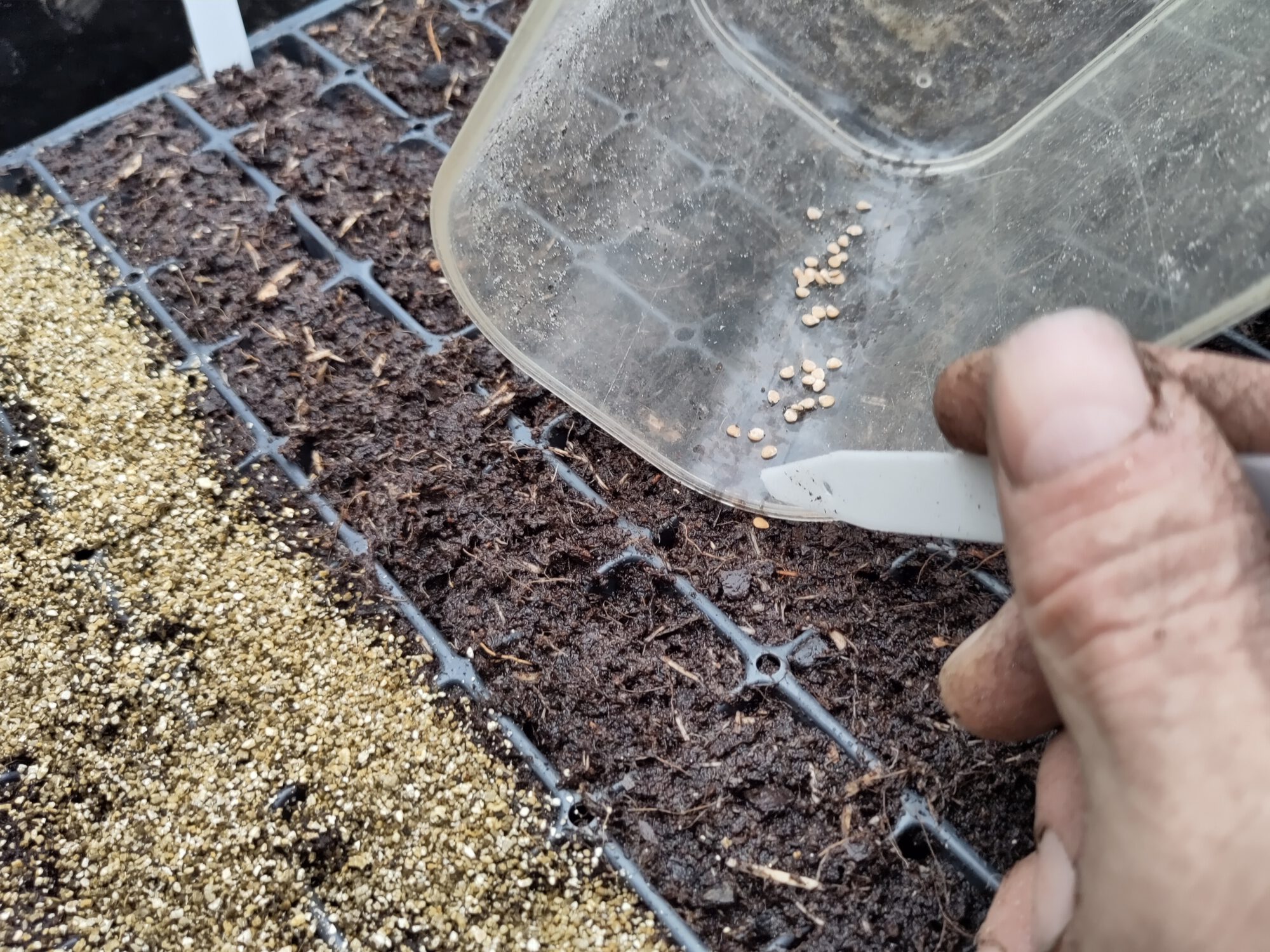 Ik ben begonnen met tomaten, koolrabi en wilde margrieten. In de koude bak volgt spinazie en op het bed tuinbonen en doperwten. Ik strooi het fijne zaaigoed dat binnen ontkiemt af met vermiculiet.