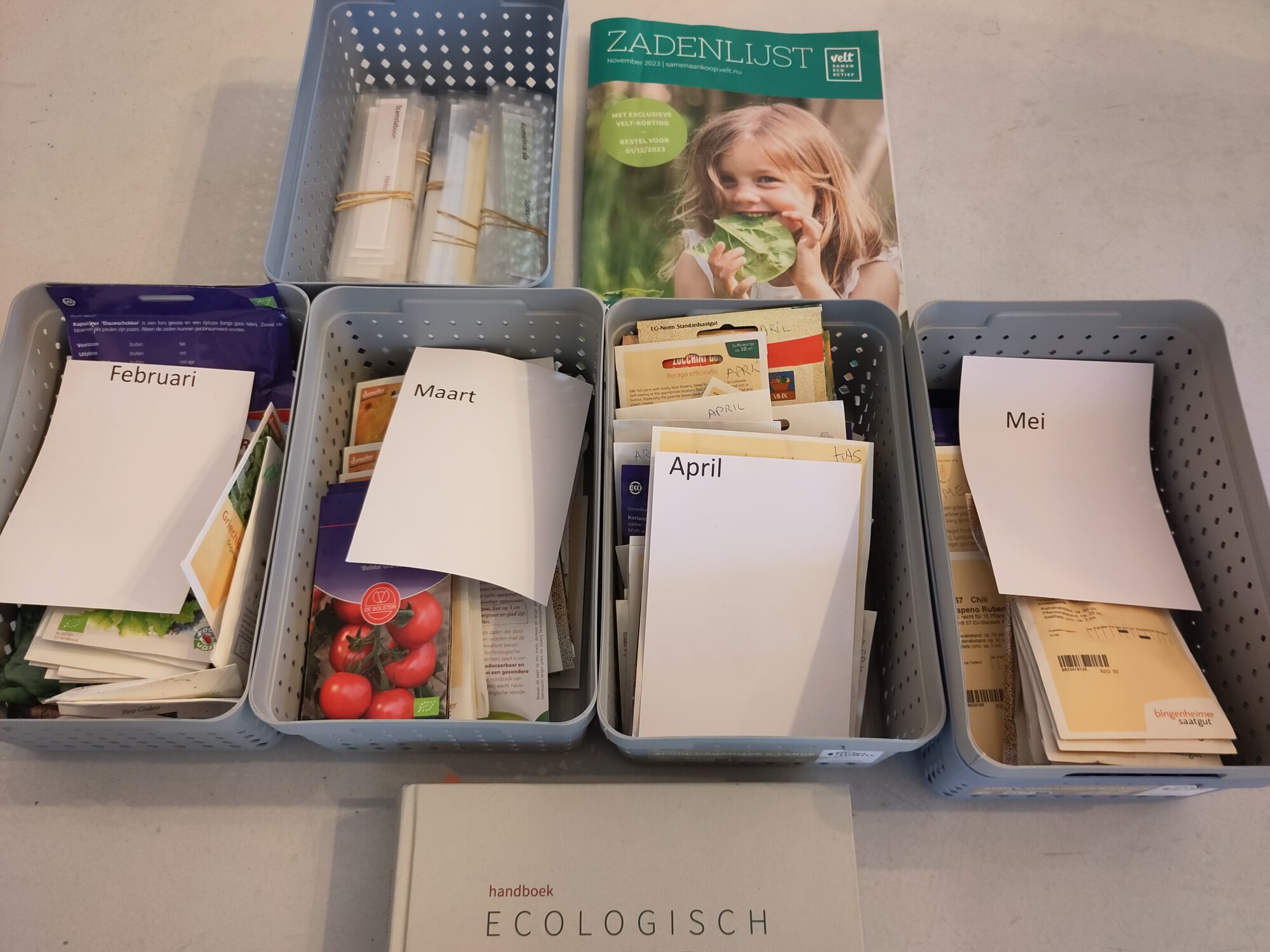 In januari viel er al iets te zaaien maar nu in februari begint het echte werk met het hoogtepunt in april. Alle zaden die hier op 20 feb binnenkwamen gesorteerd. Aanwijzingen extra gelezen en in schema gezet.