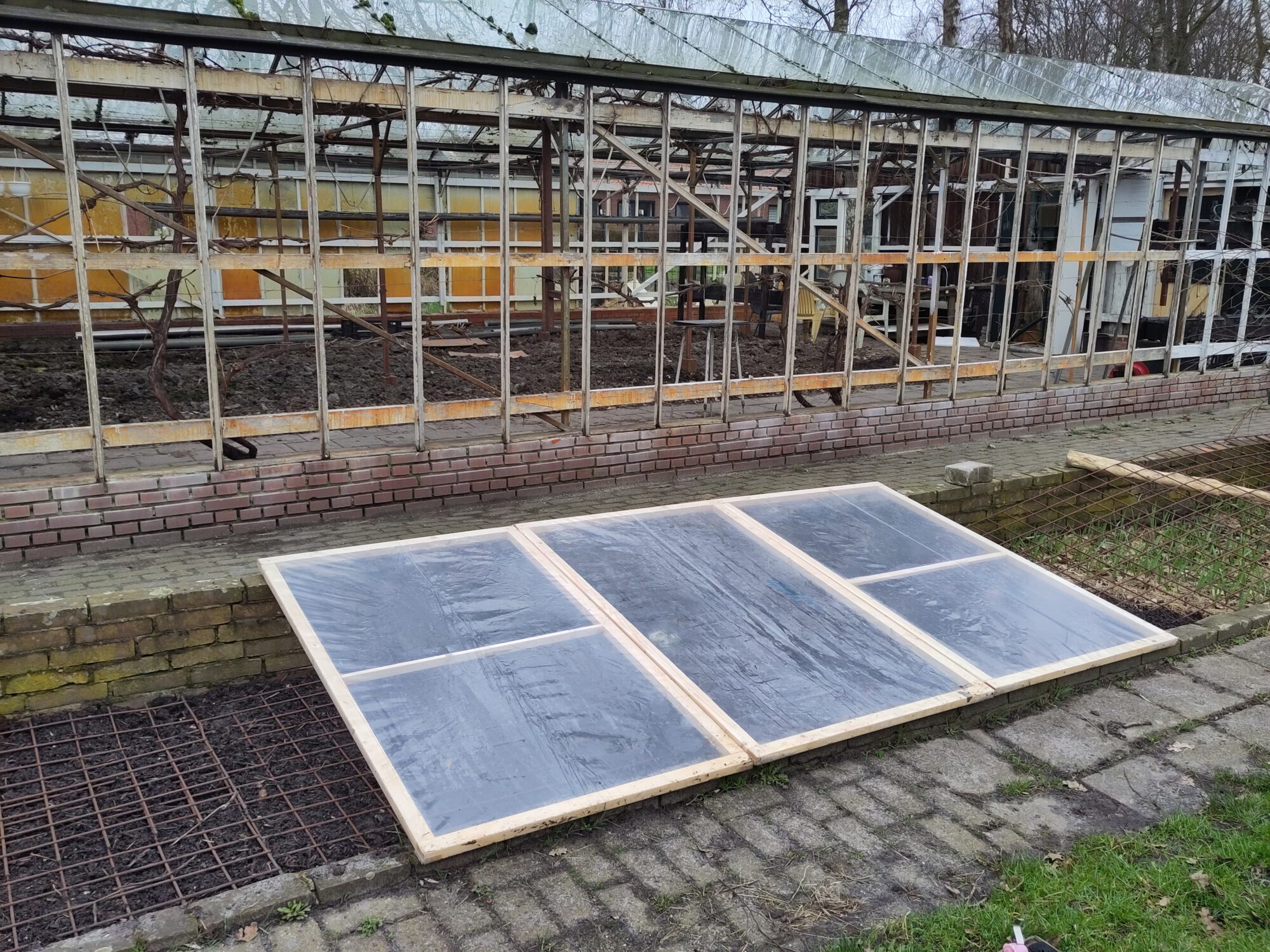 Koude bakken worden traditioneel afgedekt met éénruiters van glas met een houten lijst. Maar zo kan het ook, stuk goedkoper in ieder geval. Gebruik dik, transparant en uv- bestendige folie.
