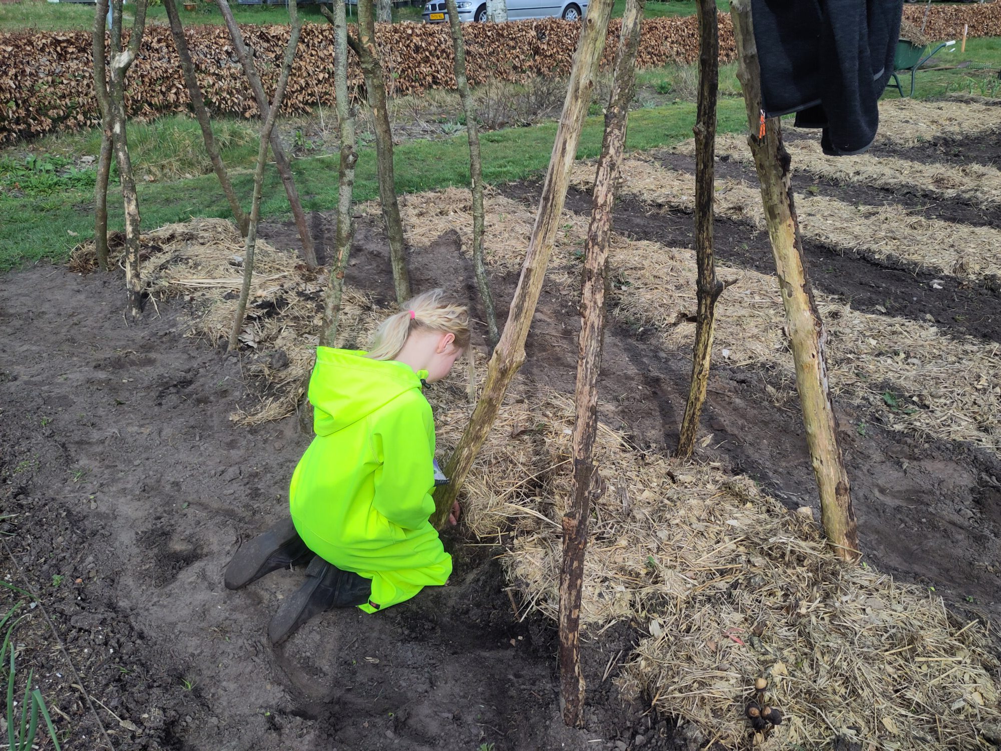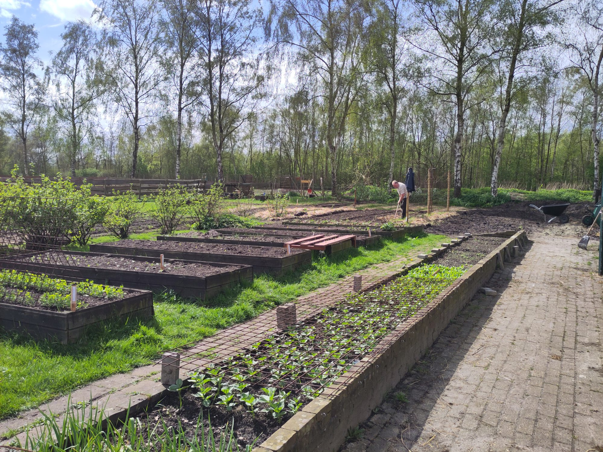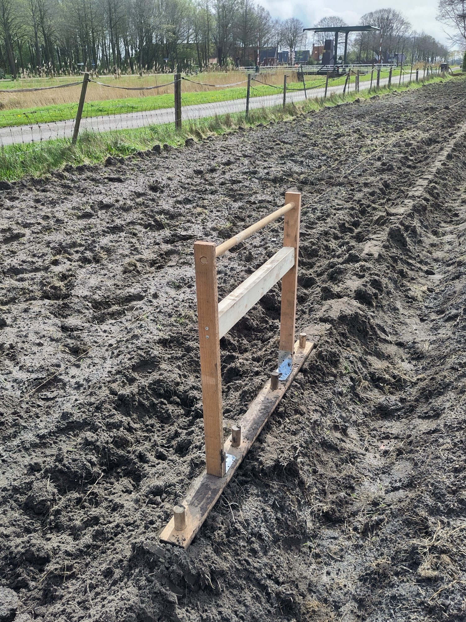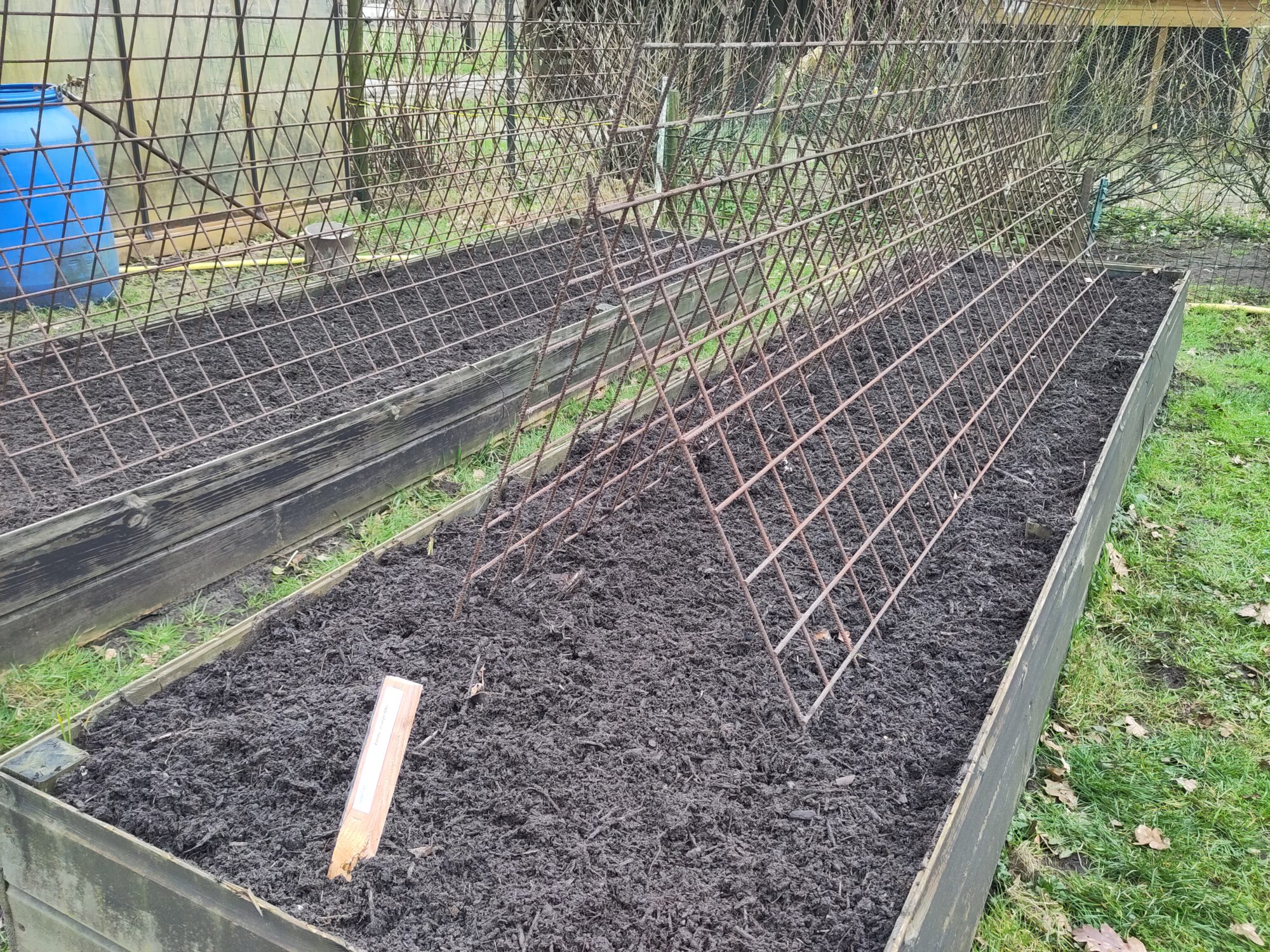 Een wapeningsmat van 10×10 of 15×15 is ook prettig om snel een rijen of kwadranten patroon in de grond uit te zetten. het houten ding verderop gebruiken wij om niet in de grond te hoeven staan bij het zaaien of poten.
