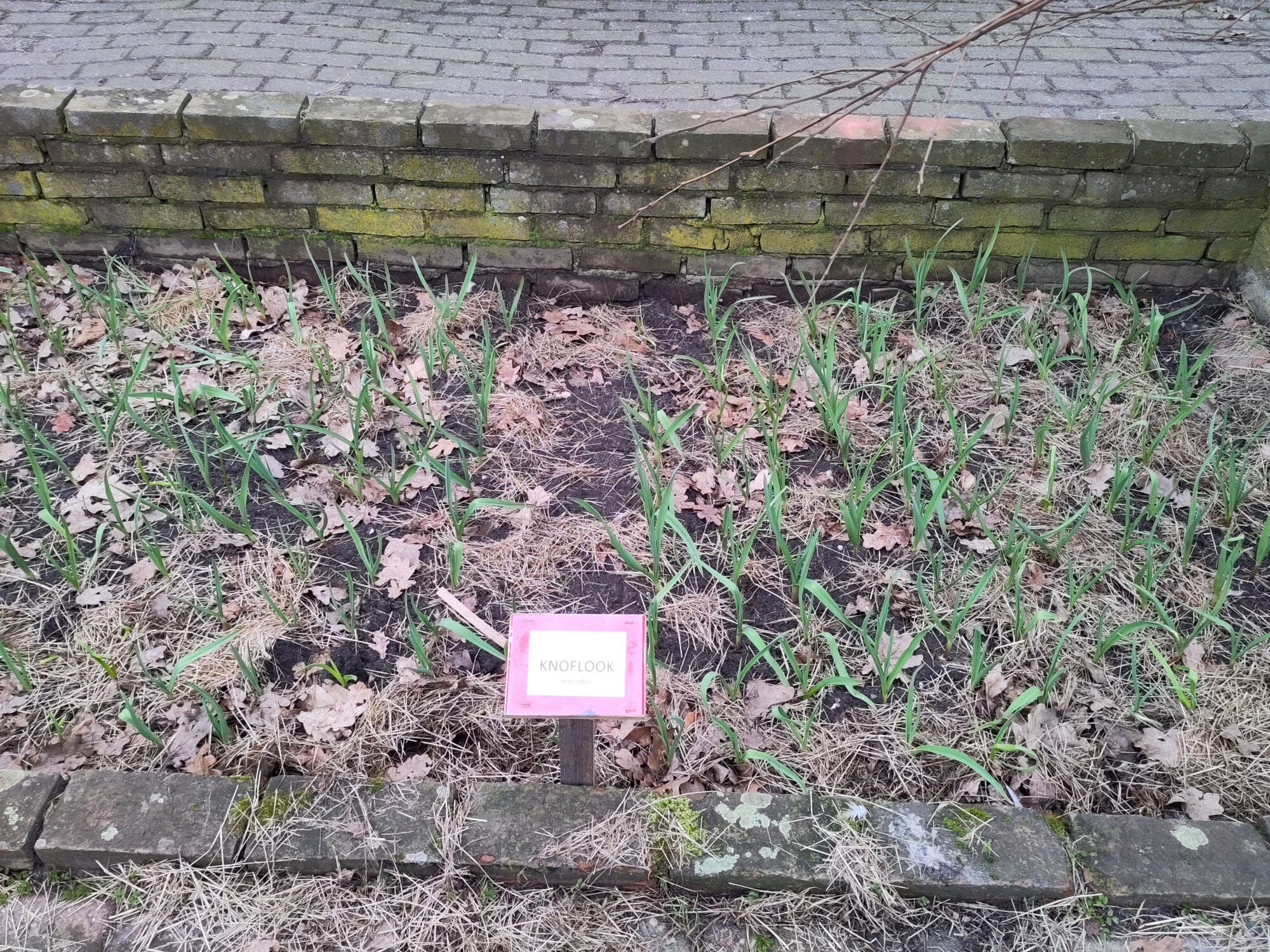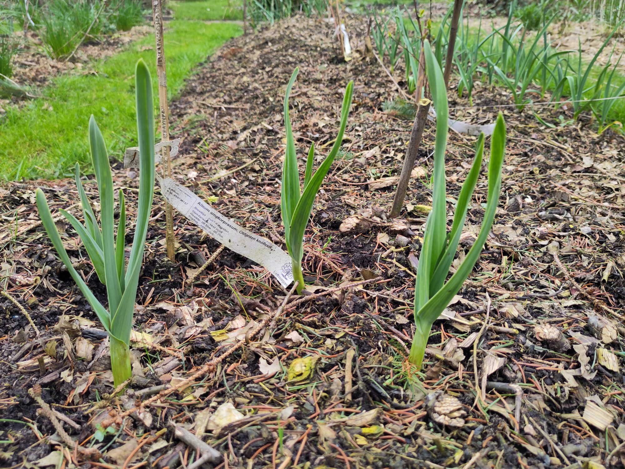 Olifantsknoflook. Nu al dikke stelen dus dat beloofd wat. Knoflook verjaagt reeën en slakken dus overal tussen planten als je er last van hebt.