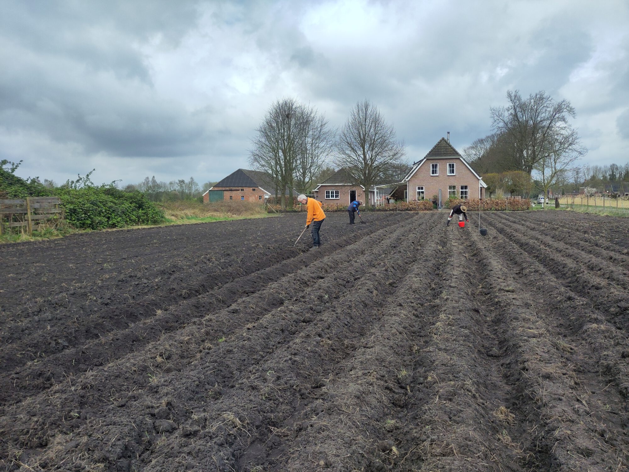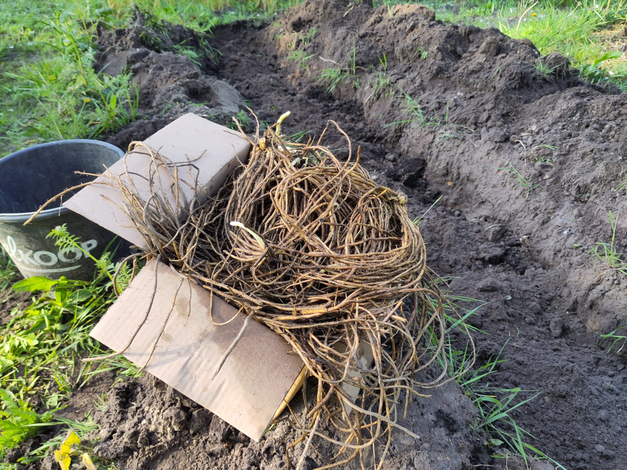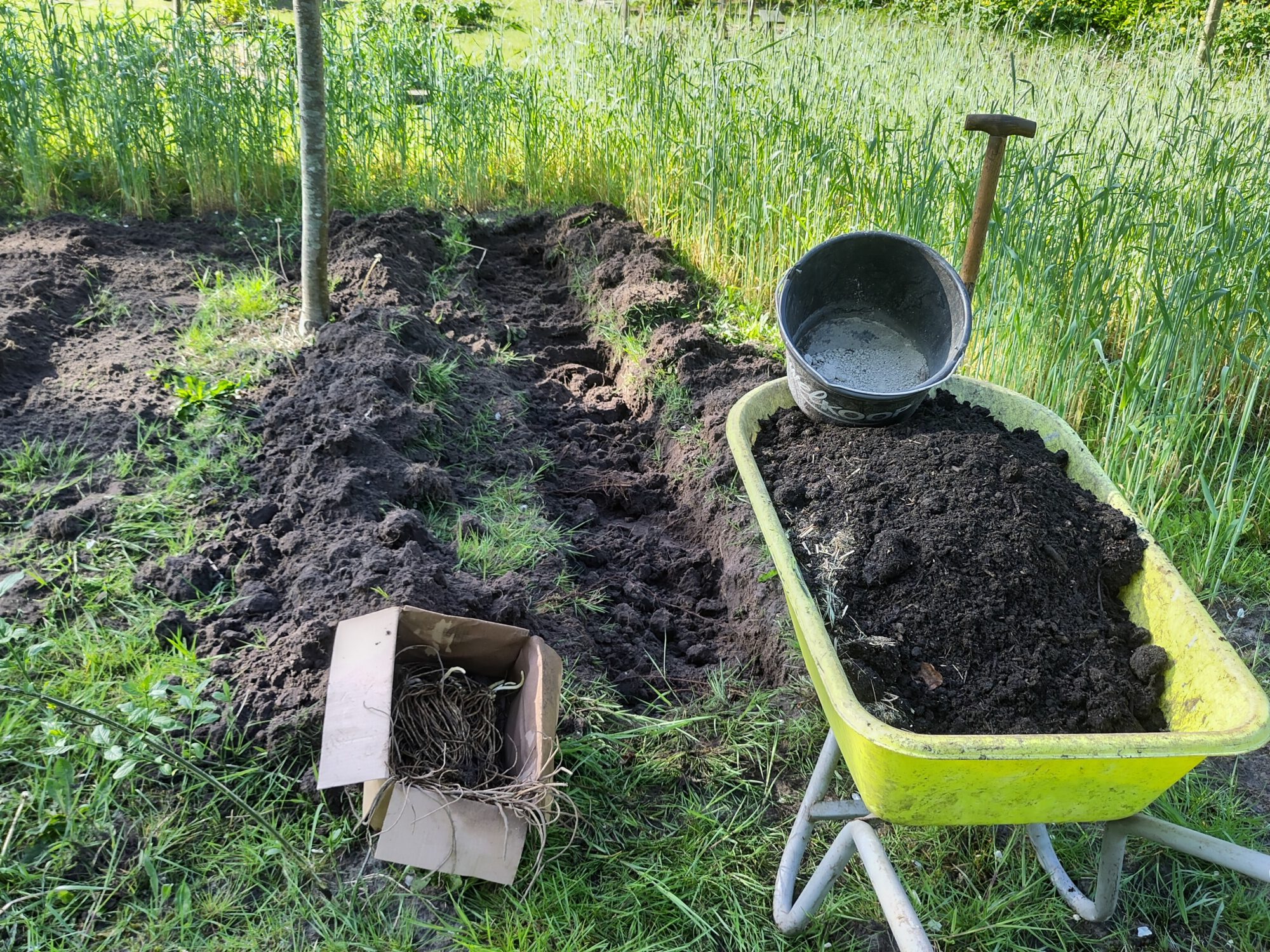 Je kunt asperges zaaien, maar hier heb ik meteen aspergeklauwen besteld. Die zijn 2-jarig. Niet heel duur. Ze lopen al uit dus ze moeten snel de grond in en licht vochtig blijven. Het proces begint met een geul van 40 cm breed en 20 cm diep in Noord-Zuid richting.