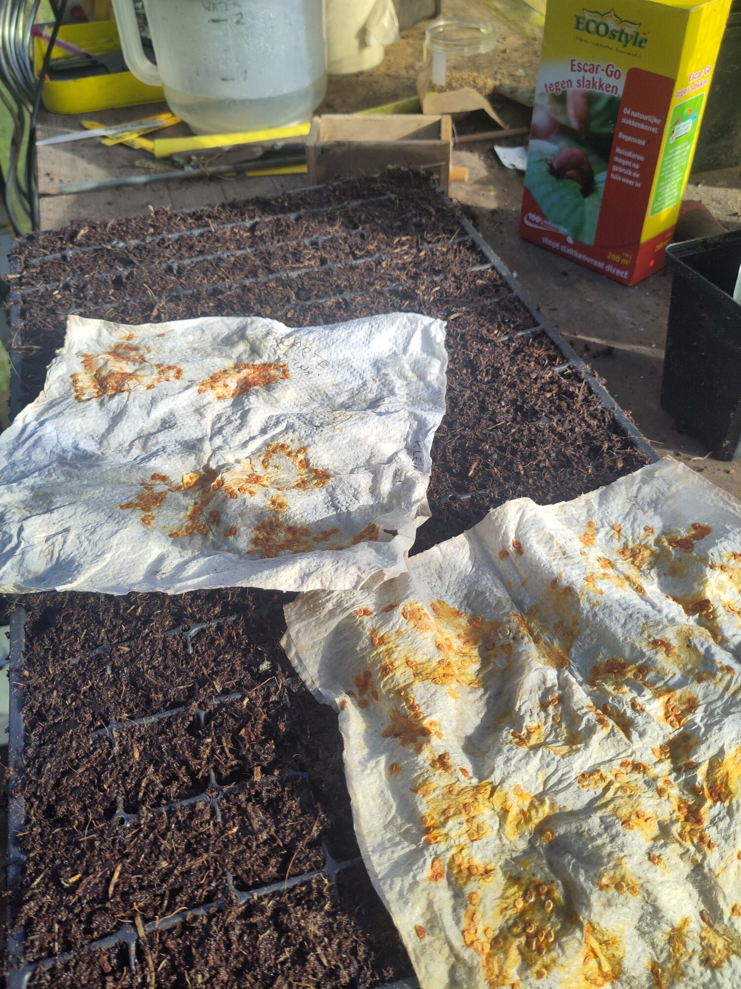 Biomix veenvrijer grond is tikkeltje grof maar ik waag het erop om hierin te zaaien. Goed natmaken en mengen.