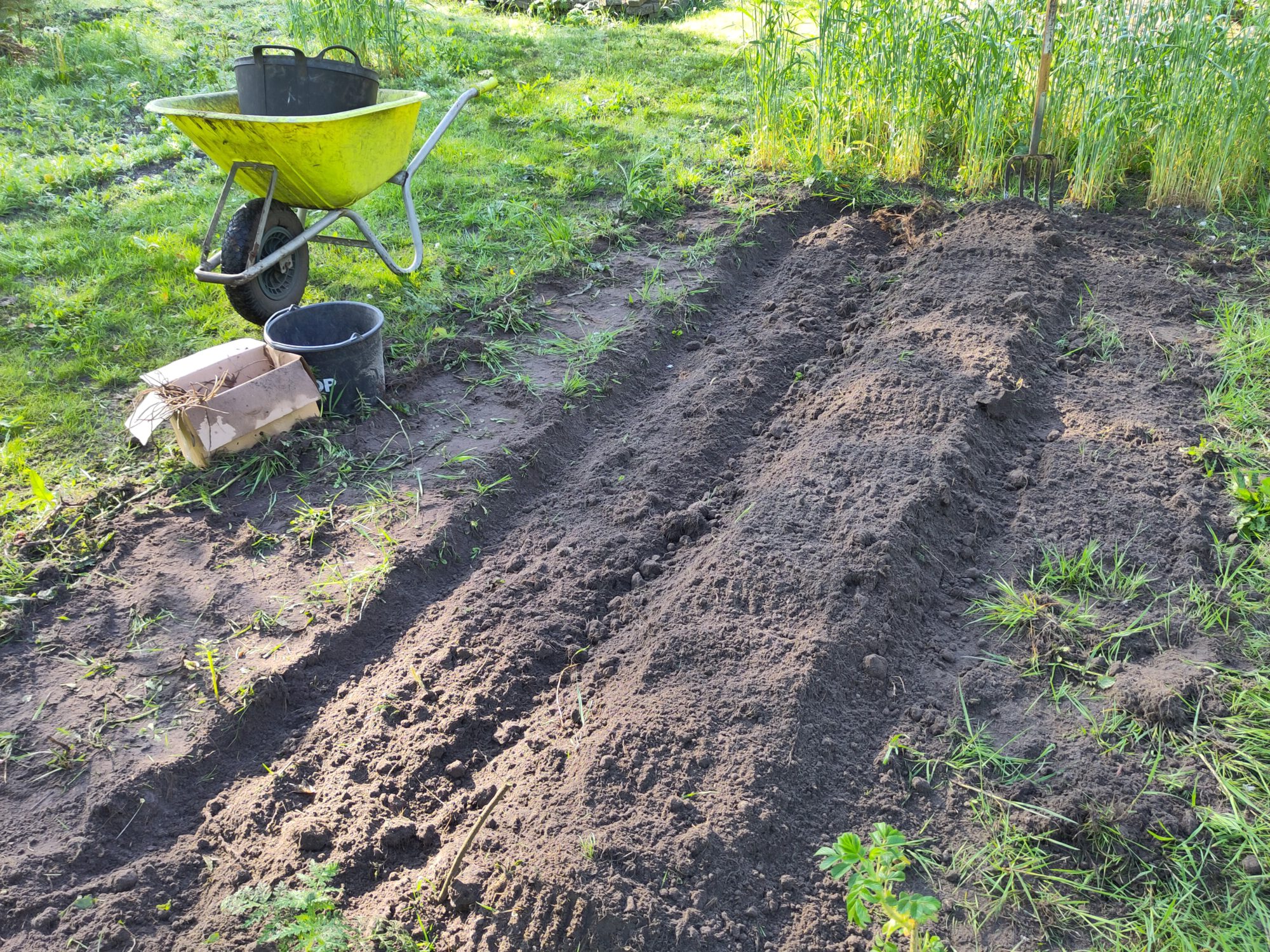 Nu vullen met grond. De overgebleven grond ligt ernaast om met de groei geleidelijk de geul verder op te vullen. In dit jaar kan nog niet geoogst worden. De bedden moeten gemulchd worden, vrij van onkruid zijn en af en toe een beetje compost en kali erbij doet ze goed. In de herfst het loof op 10 cm inkorten. De rijen goed markeren. Tussen de rijen minstens een meter vrij houden voor verdere uitgroei. Bij droogte water geven.