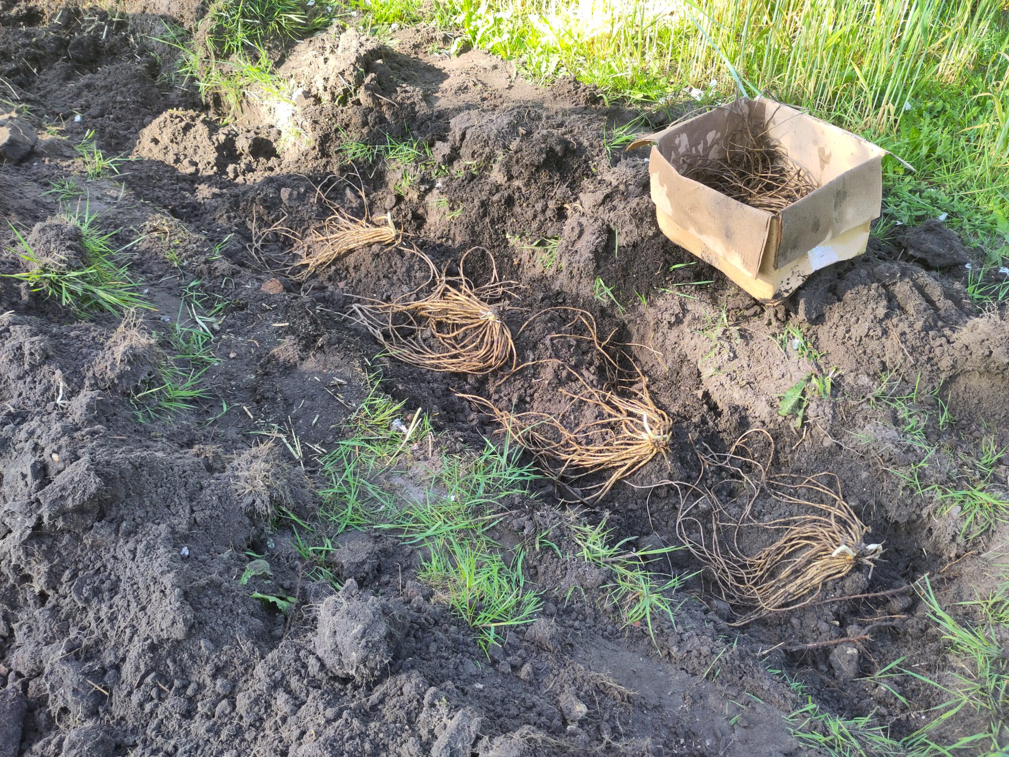 De klauwen met wortels goed uitgespreid op elk hoopje leggen met uitlopers in de lengte richting.