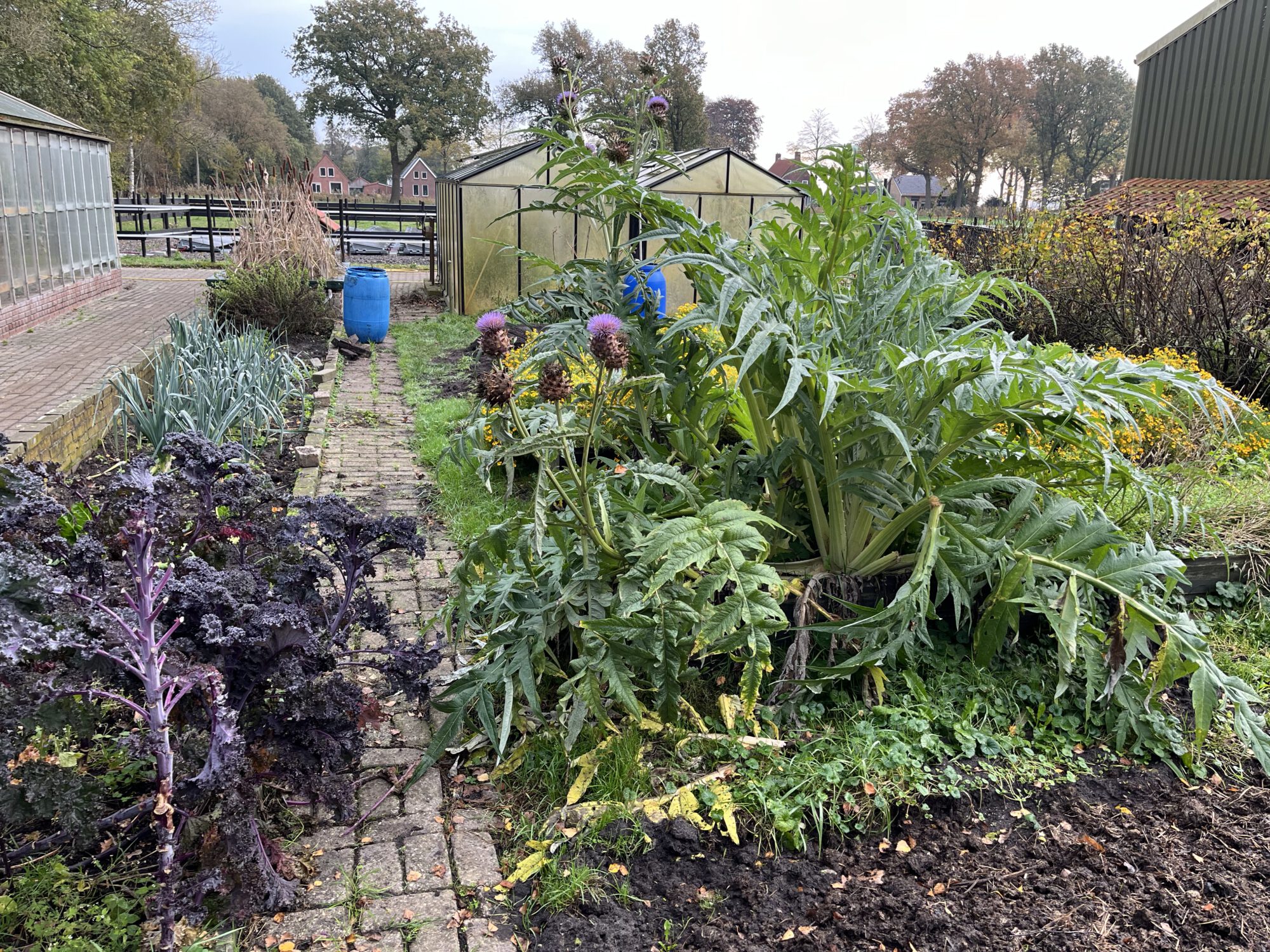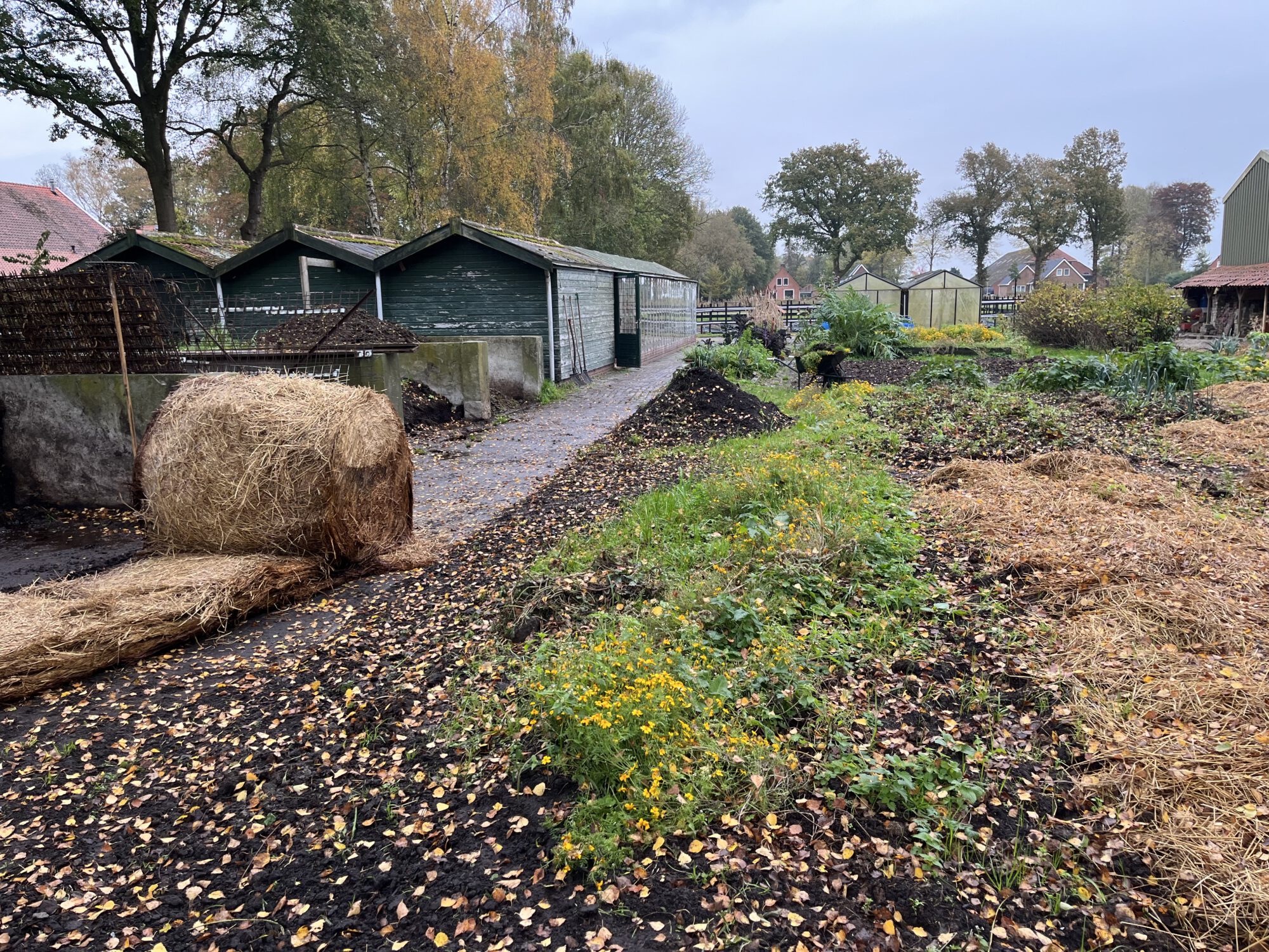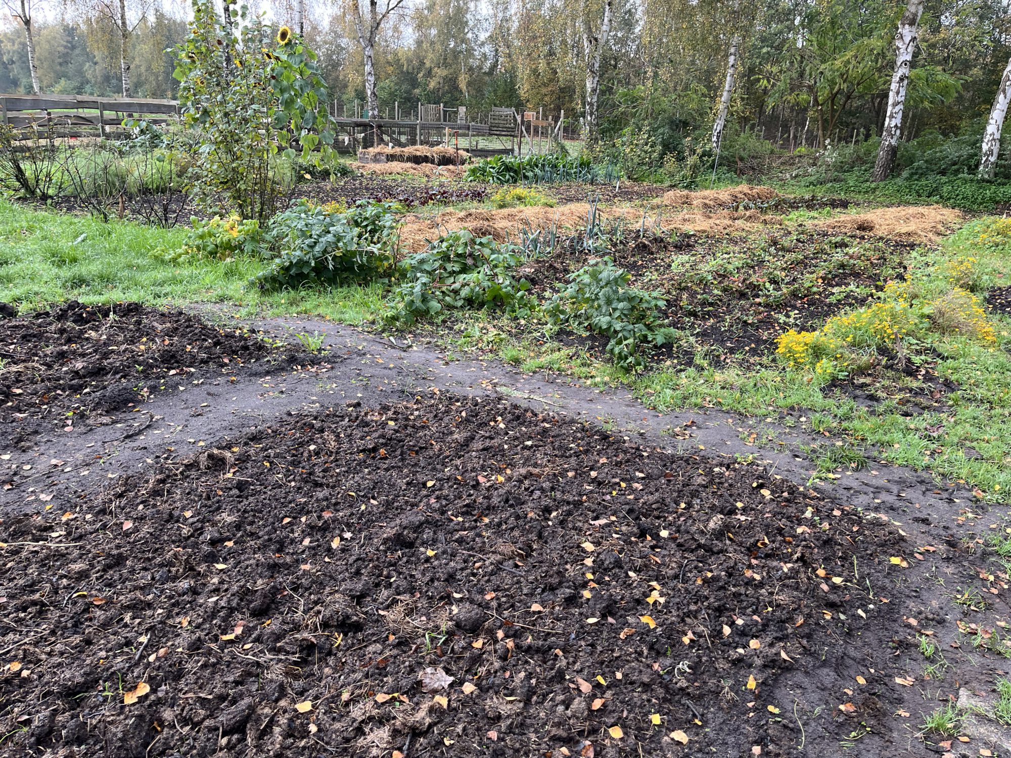 Sommige bedden worden al winterklaar gemaakt. Na grondig schoffelwerk op de inmiddels lekker rulle grond komt een laagje bijna verteerde paardenmest. Barstensvol wormen. Daarover komt een flinke laag stro. Waar nodig trekken we de paden opnieuw. Nu aangestampte aarde, volgend jaar snippers. De graspaden die er waren verdwijnen, leuk maar te veel werk. Je kan natuurlijk ook hooi gebruiken om te mulchen maar dan wel hooi zonder zaad. Of alles vol zetten met groenbemesters. Bijvoorbeeld Japanse haver, bladrammenas, wikke, klaver, winterrogge. Of alles door elkaar.