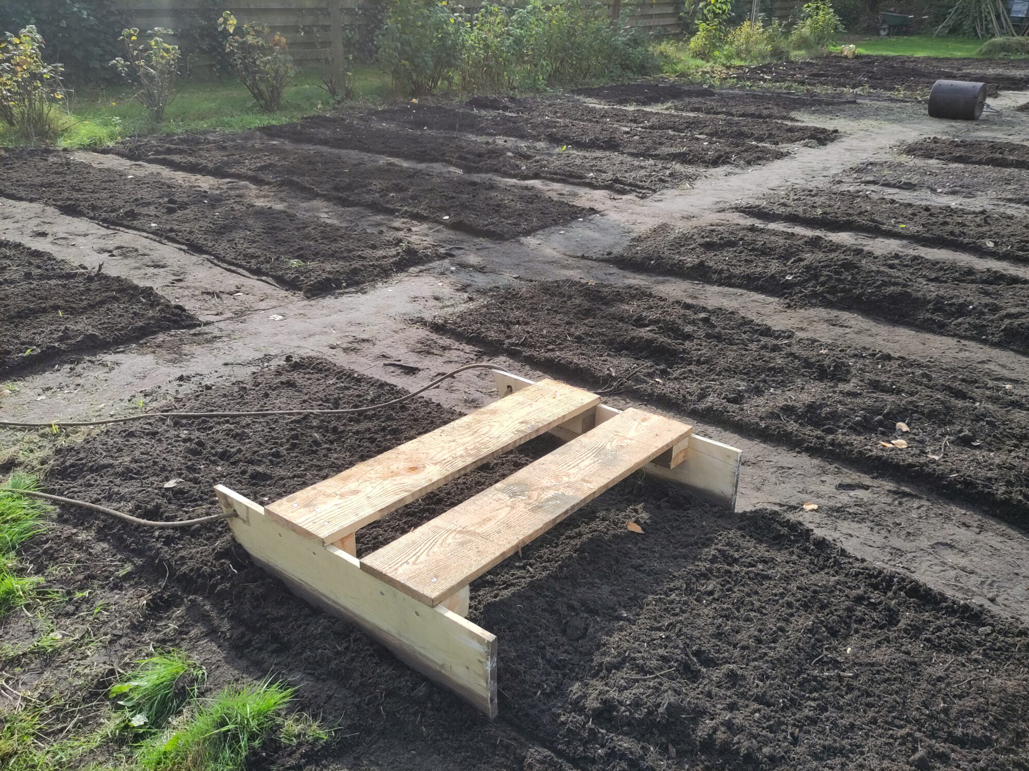 De herfst en winter vragen om nieuwe tuinplannen. Soms om het opzetten van nieuwe bedden. Voor dat laatste gebruik ik een slee van exact 100 cm breed die ik langs een pad of touwtje vooruit sleep. Het spoor is dan de breedte van het bed of pad, of wat je maar wil. Vooral handig bij de grotere tuinen. Op de foto zie je mijn exemplaar, maar je kan hem natuurlijk in elke gewenste breedte maken. Omdat het ding goed ‘spoort’ kan je ook over het pad lopen en het ding aan 1 touw naast je voort trekken.