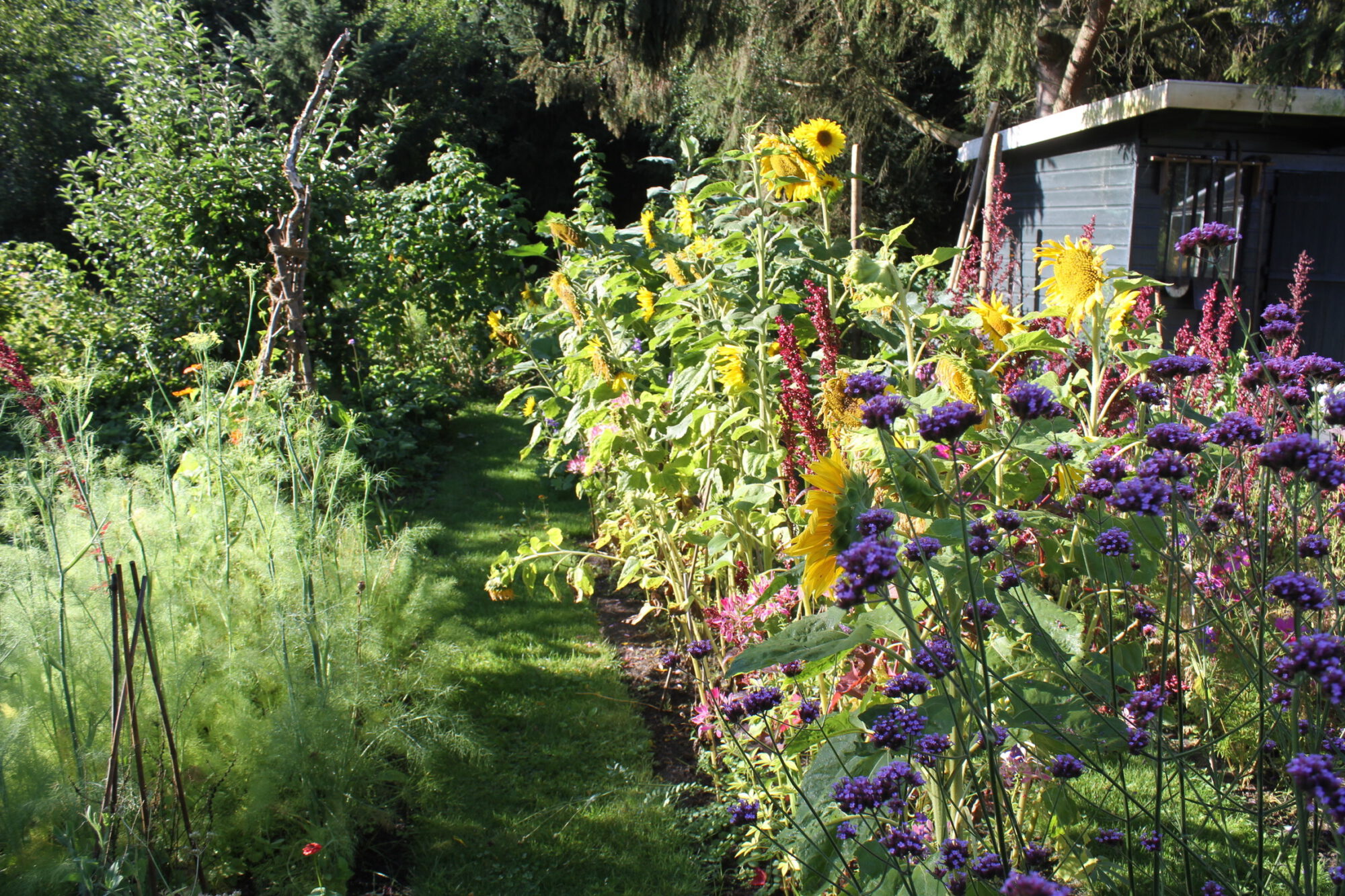 Als alles goed gaat kan er geoogst worden. De laatste tuinbonen zijn nu wel weg, doperwten ook. Kapucijners zijn nu rijp. Heerlijk, deze verse erwtensoorten. De bonen moeten nog wel even doorgroeien. Kruiden in de kas zijn in bloei of groeien nog even door, maar kunnen nu enorme afmetingen krijgen zoals venkel. Ik laat altijd enkele planten in zaad komen. Mosterd die je alleen heel jong plukt, net als tuinkers. Veel sla staat op de rand of is al aan het doorschieten helaas. De afzet van groentes langs de weg of in de keuken moet goed geregeld zijn. Ook de voedselbank kan bediend worden als die niet te ver weg is. Hoe lokaler hoe beter. Het is nu ook tijd om bedden die vrijkomen weer klaar te maken voor nieuwe teelt. We hebben de preiplanten uitgeplant, nieuwe worteltjes en sla gezaaid, evenals spinazie en andijvie. In de ‘groentebijbel’ van Velt staan talloze groentes die ook in de zomer of later gezaaid kunnen worden.