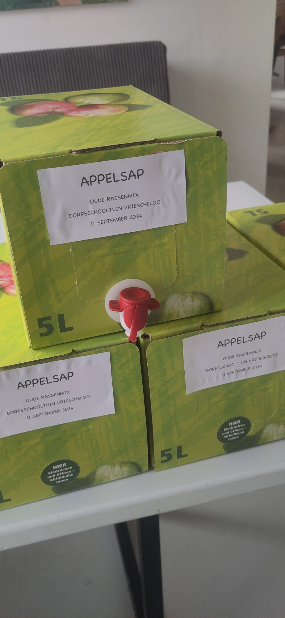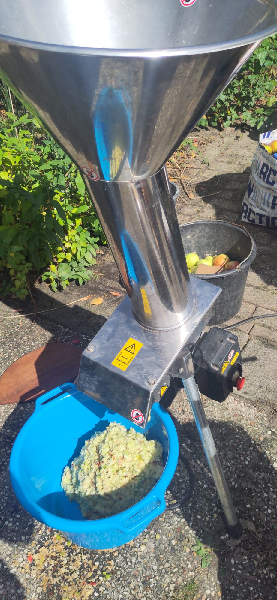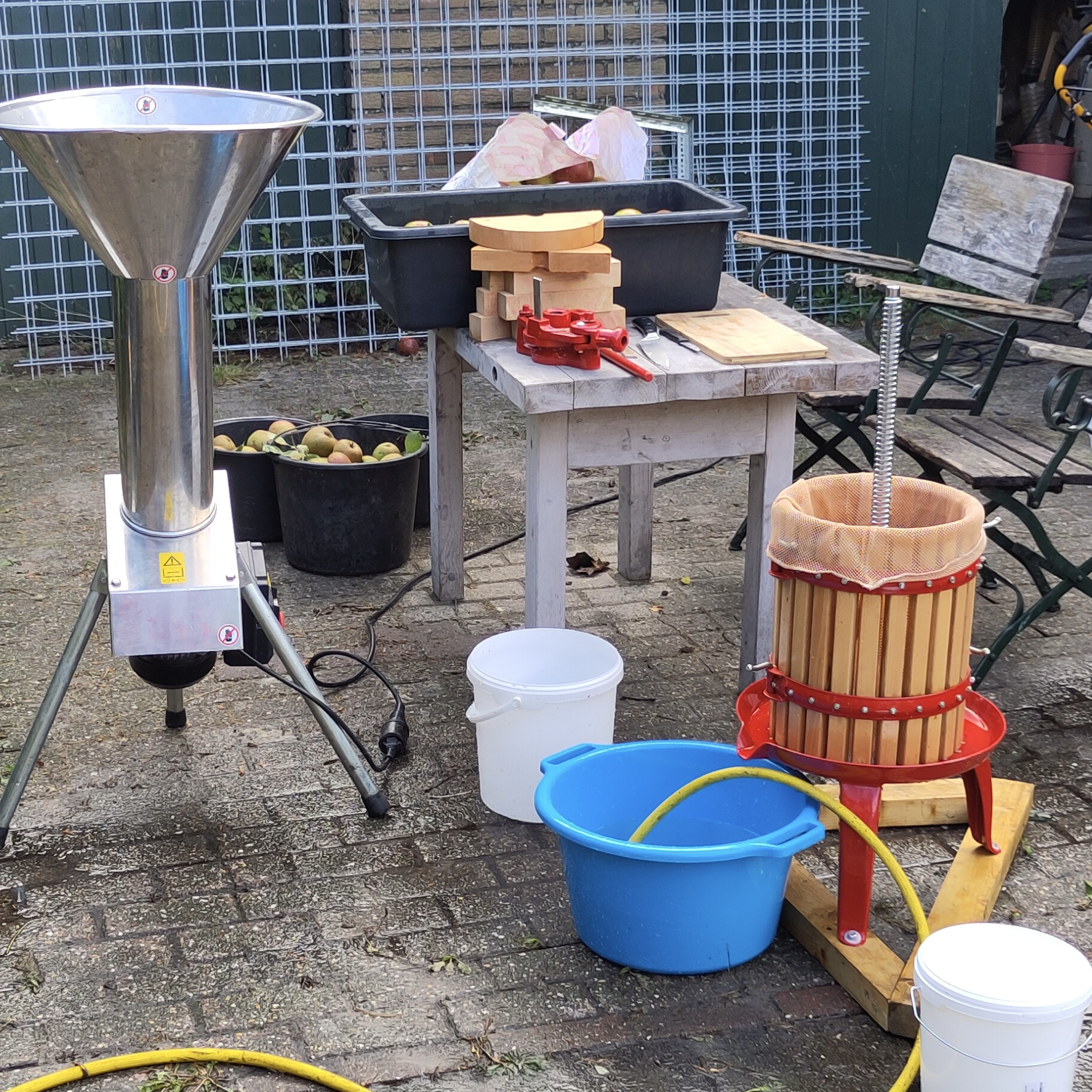 Je kunt dit allemaal lenen: shredder, pers, emmers en teilen en een automatische pasteuriseerpan om appels bijvoorbeeld 15 minuten op 75 graden te verhitten en daarna af te tappen met een kraantje. Bag-in-a-box dozen en vulzakken met kraantje van 3 liter zijn bij ons te koop voor 3 euro per stuk.